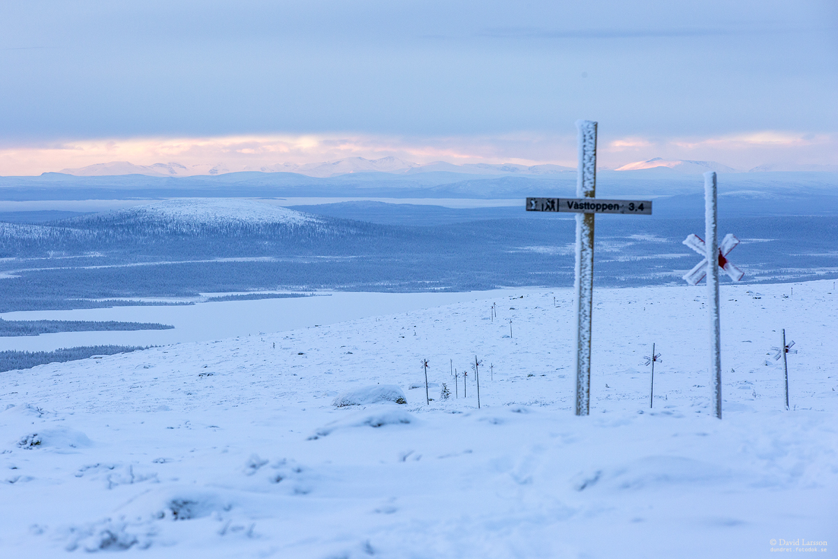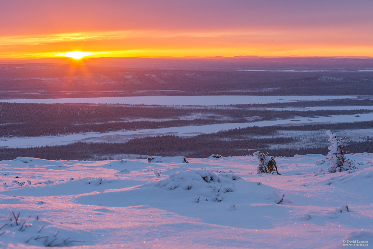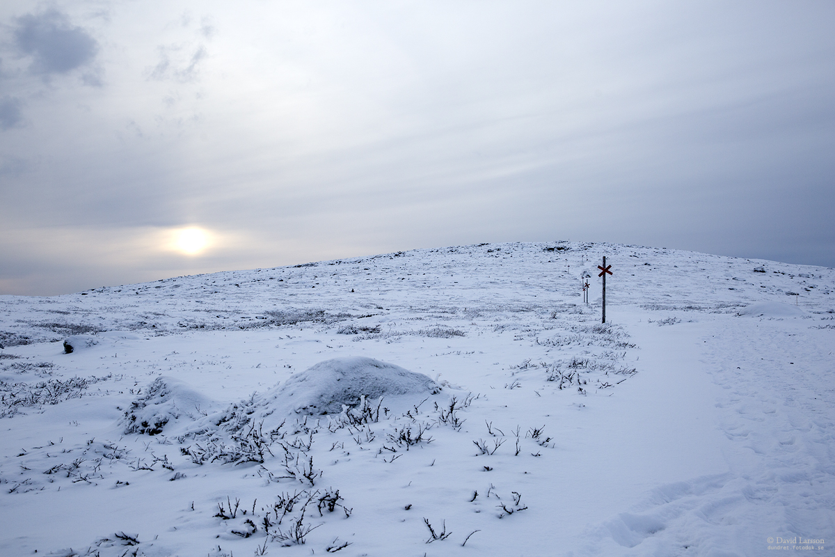 Under vintersäsongen november–april håller Åke på toppen-stugan öppet mellan 10 och 14 på söndagar. Denna den andra söndagen för säsongen var bilvägen upp på kalfjället ännu körbar och det blev tid att vandra upp till stugan på eftermiddagen närmare stängningstid. För detta belönades man med en vacker solnedgång när ljuset plötsligt strålade in under molnen.
