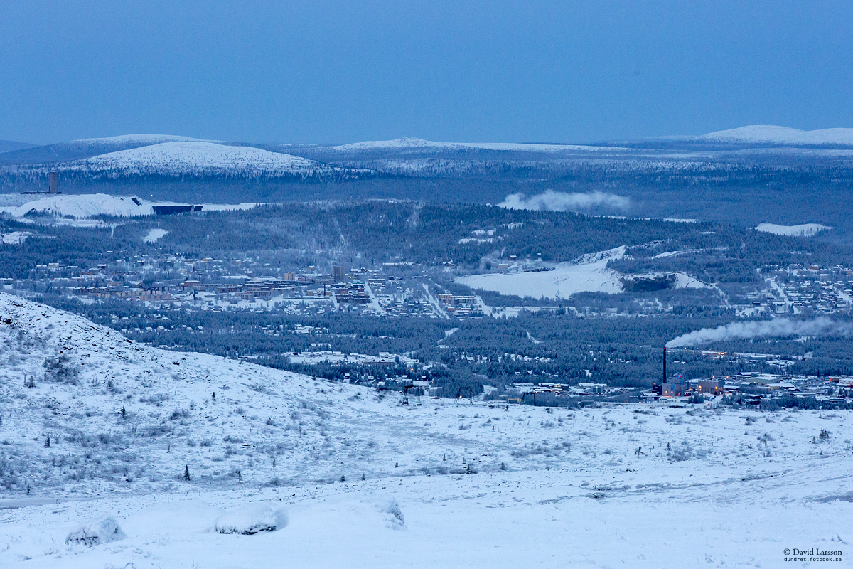 Novemberskymning över ett gruvsamhälle på väg ner från toppen.