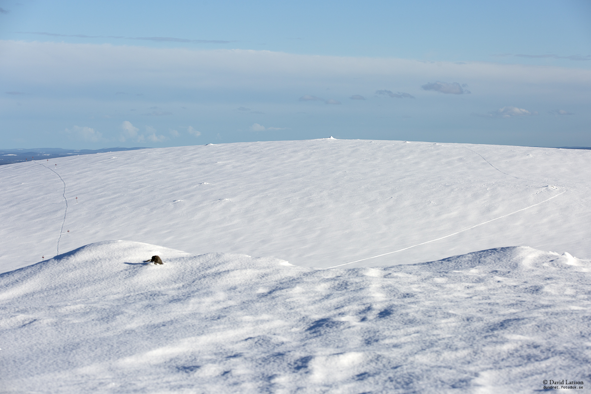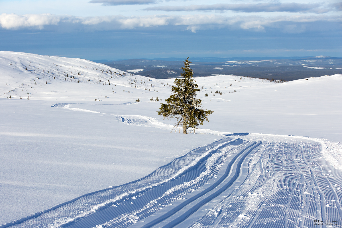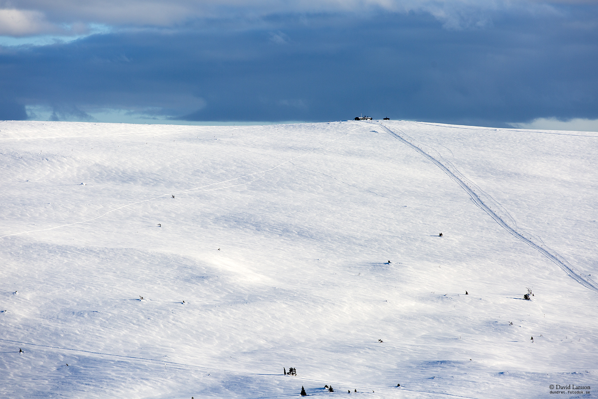 Pistmaskinen har skapat en intressant slinga över de annars nästan helt orörda vita vidderna på fjället.