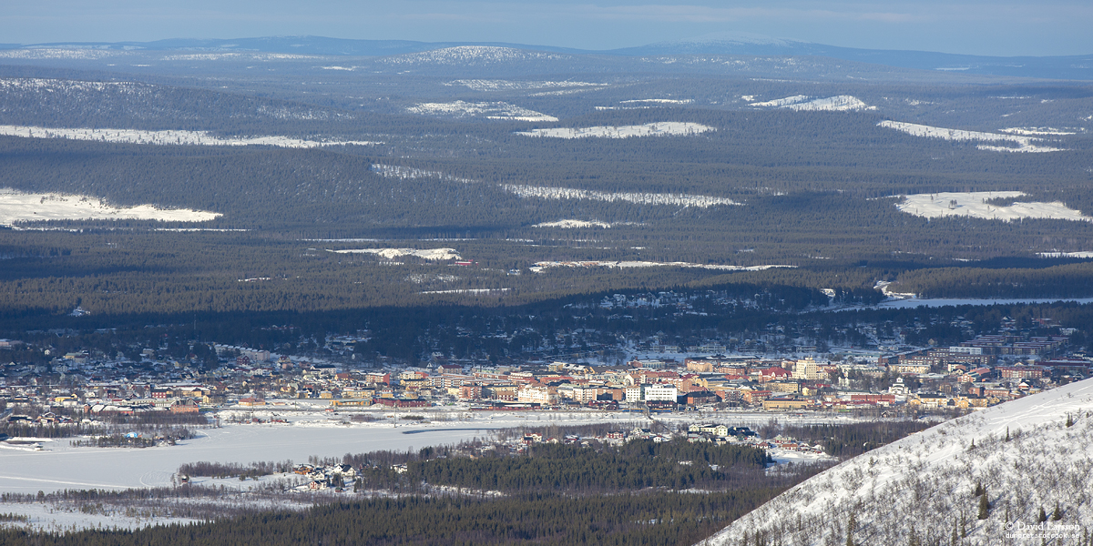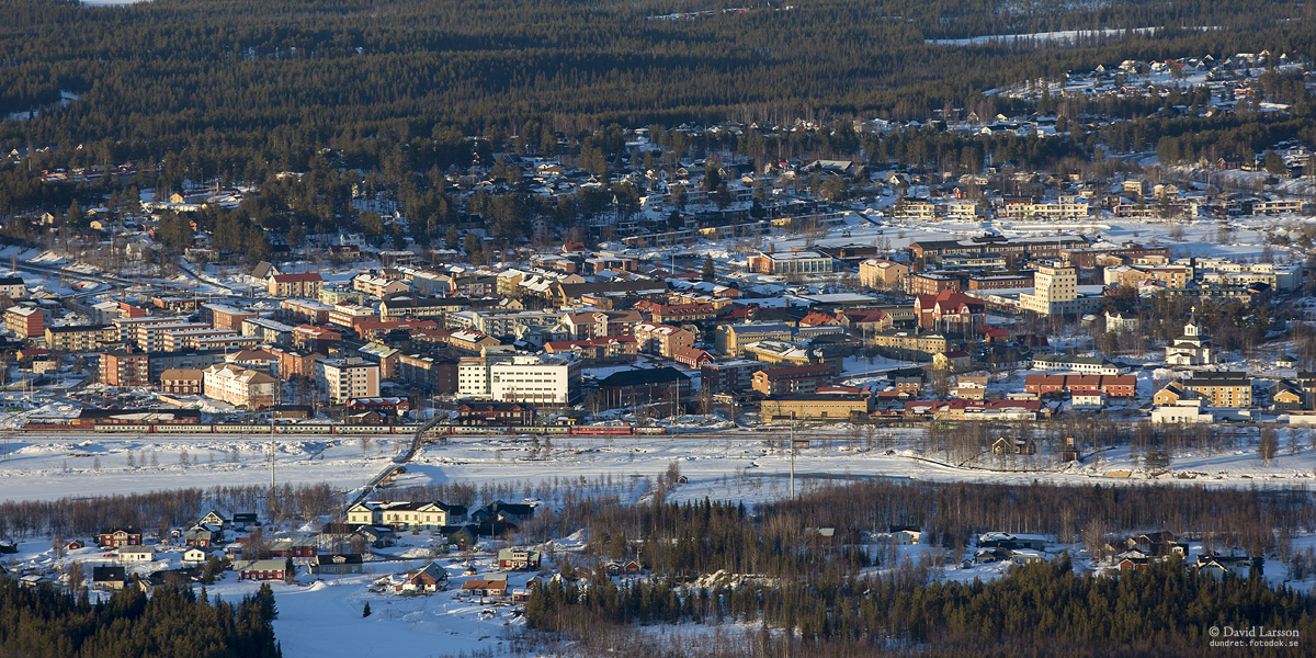 Slutligen blickar vi ner mot centrala Gällivare där nattåget mot Stockholm gör ett kort uppehåll i kvällssolen.