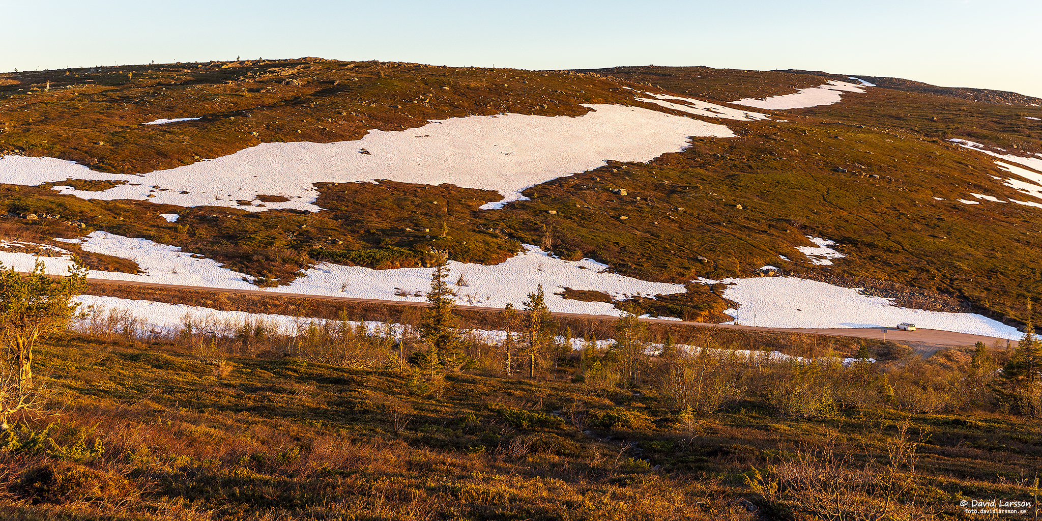 På väg upp från parkeringen mot Lilla toppen kan man se snöläget på fjället. På de flesta håll har snön smält bort och marken torkat upp men i nordsluttningarna ligger det fortfarande en hel del snö kvar på flera ställen, bland annat det stråk från vägen bort mot Västtoppen som kunnat utnyttjas för skidåkning in i juni.