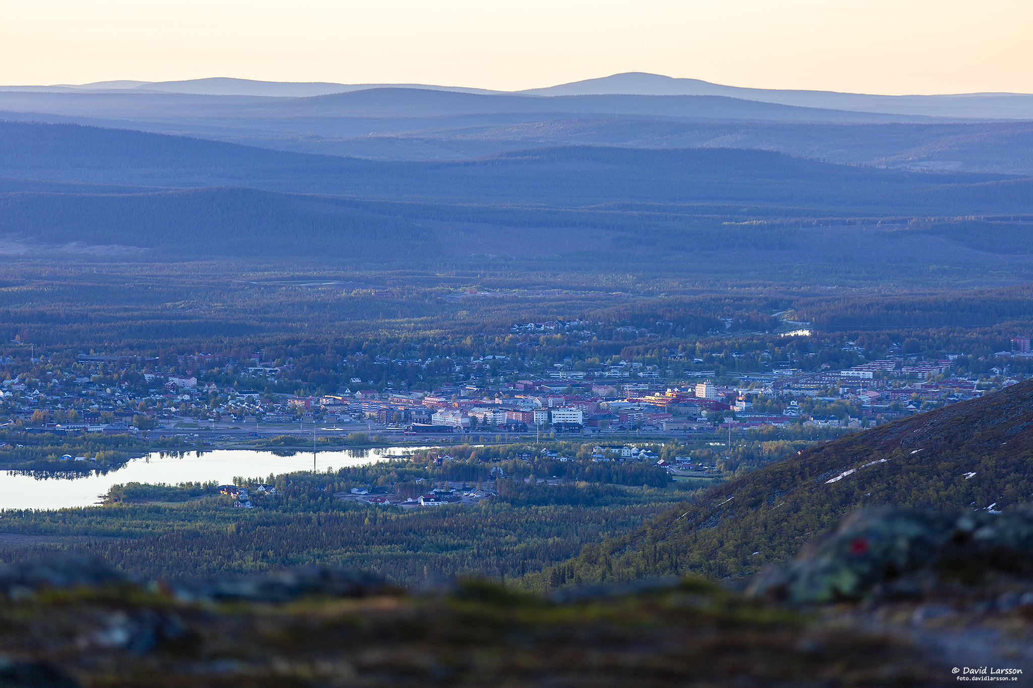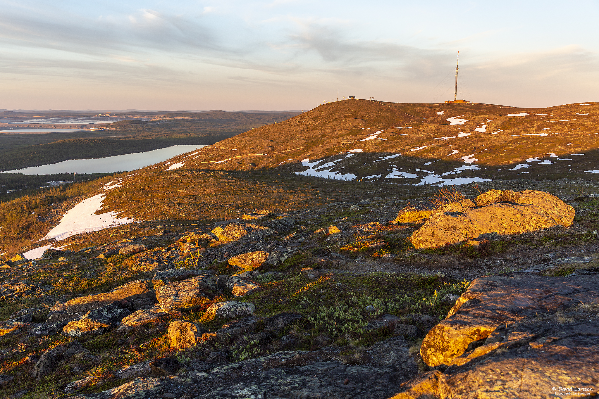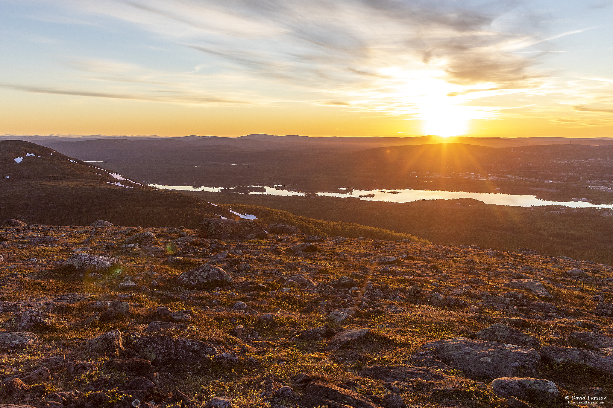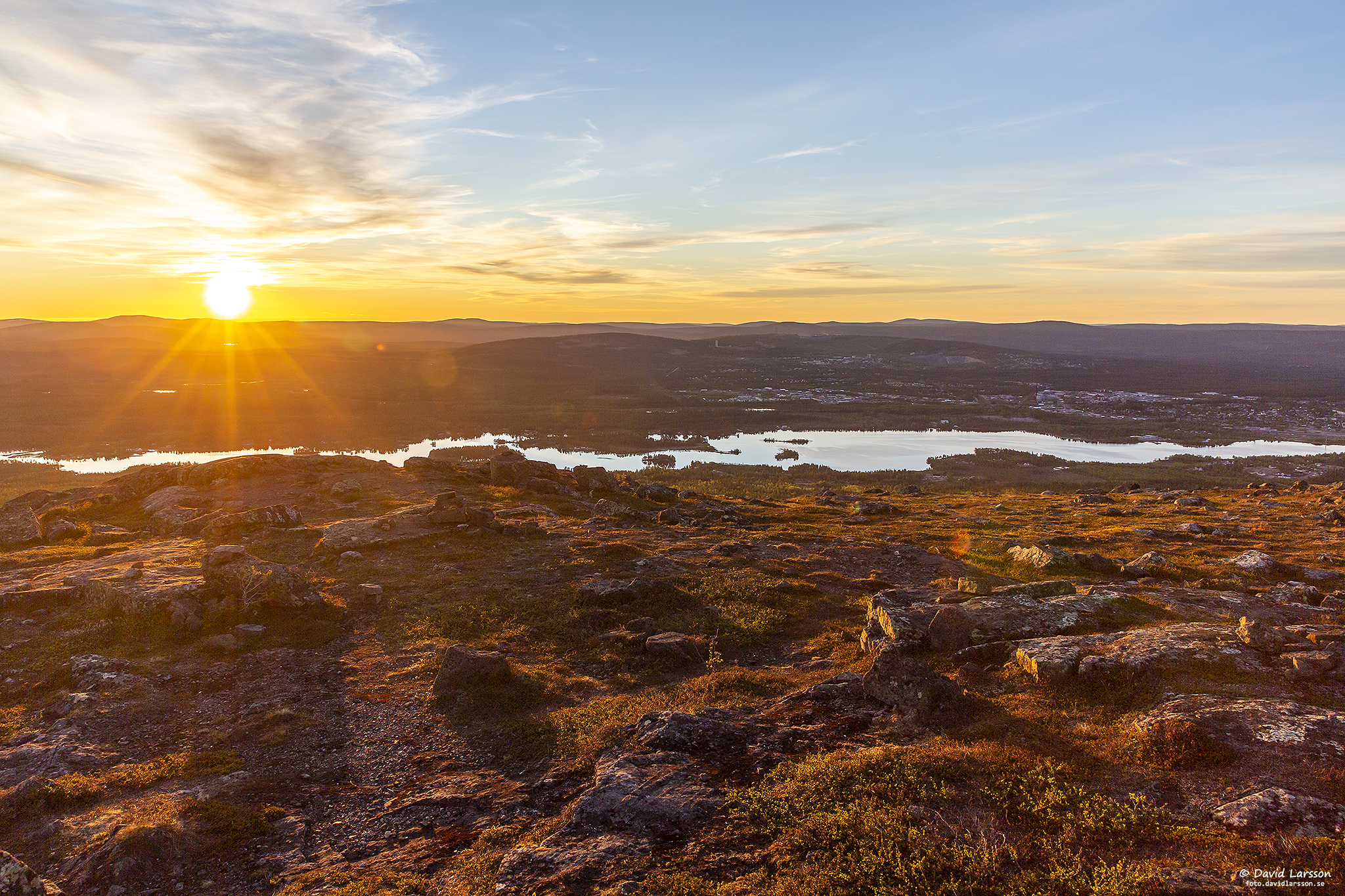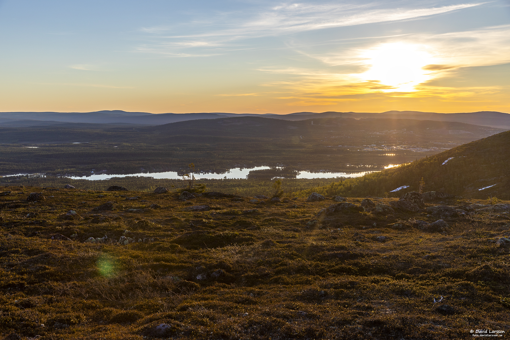 Solsken över Lilla toppen på Dundret något före midnatt med utsikt ner mot Vassaraträsk och med Gällivare och Malmberget till höger.