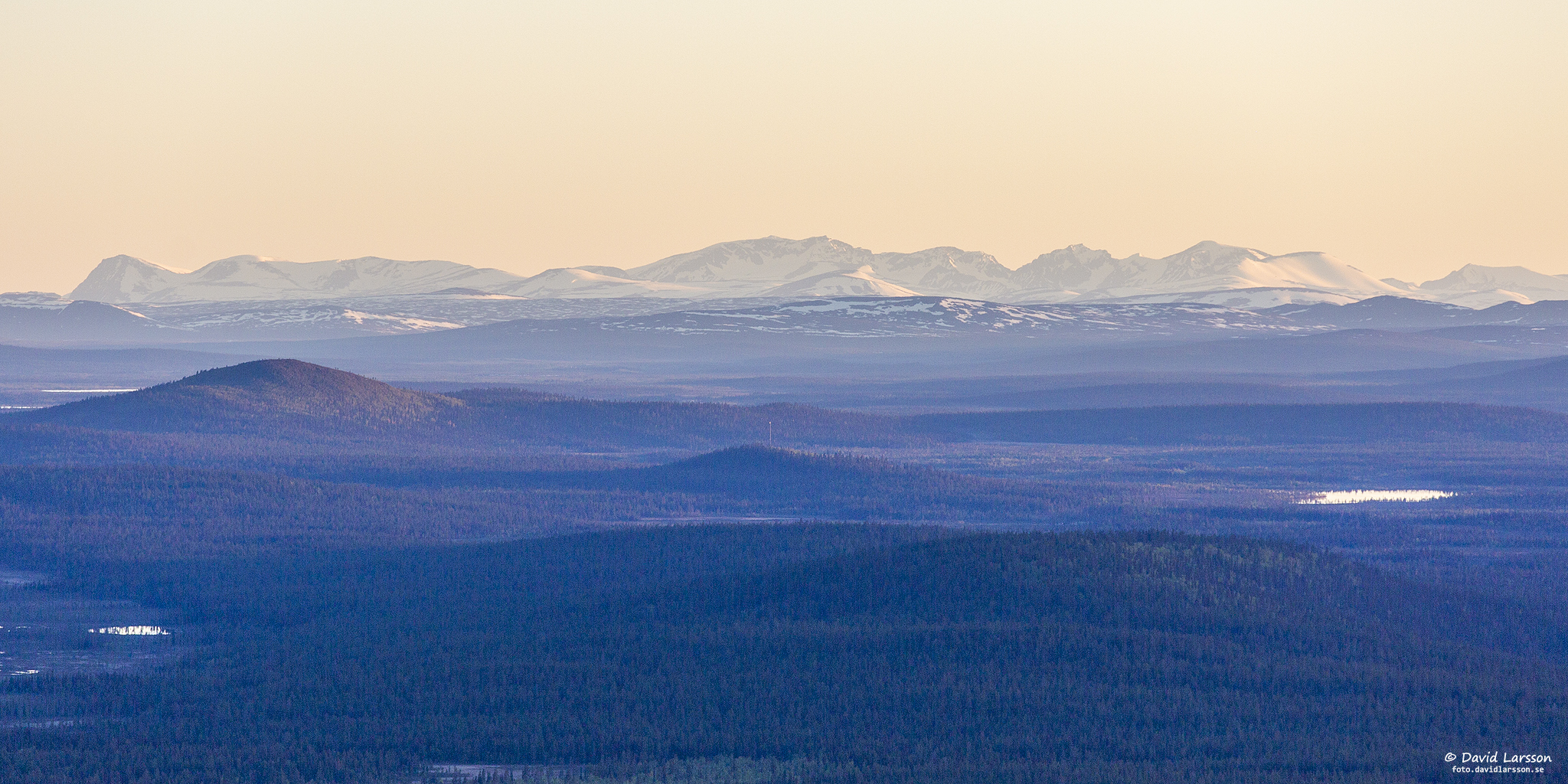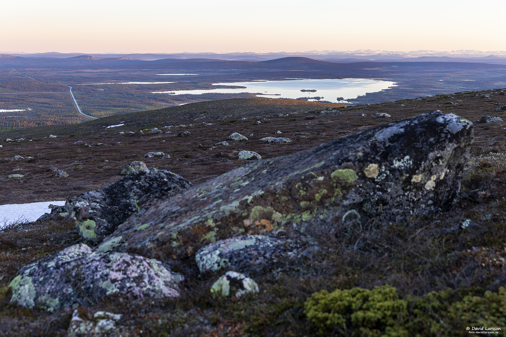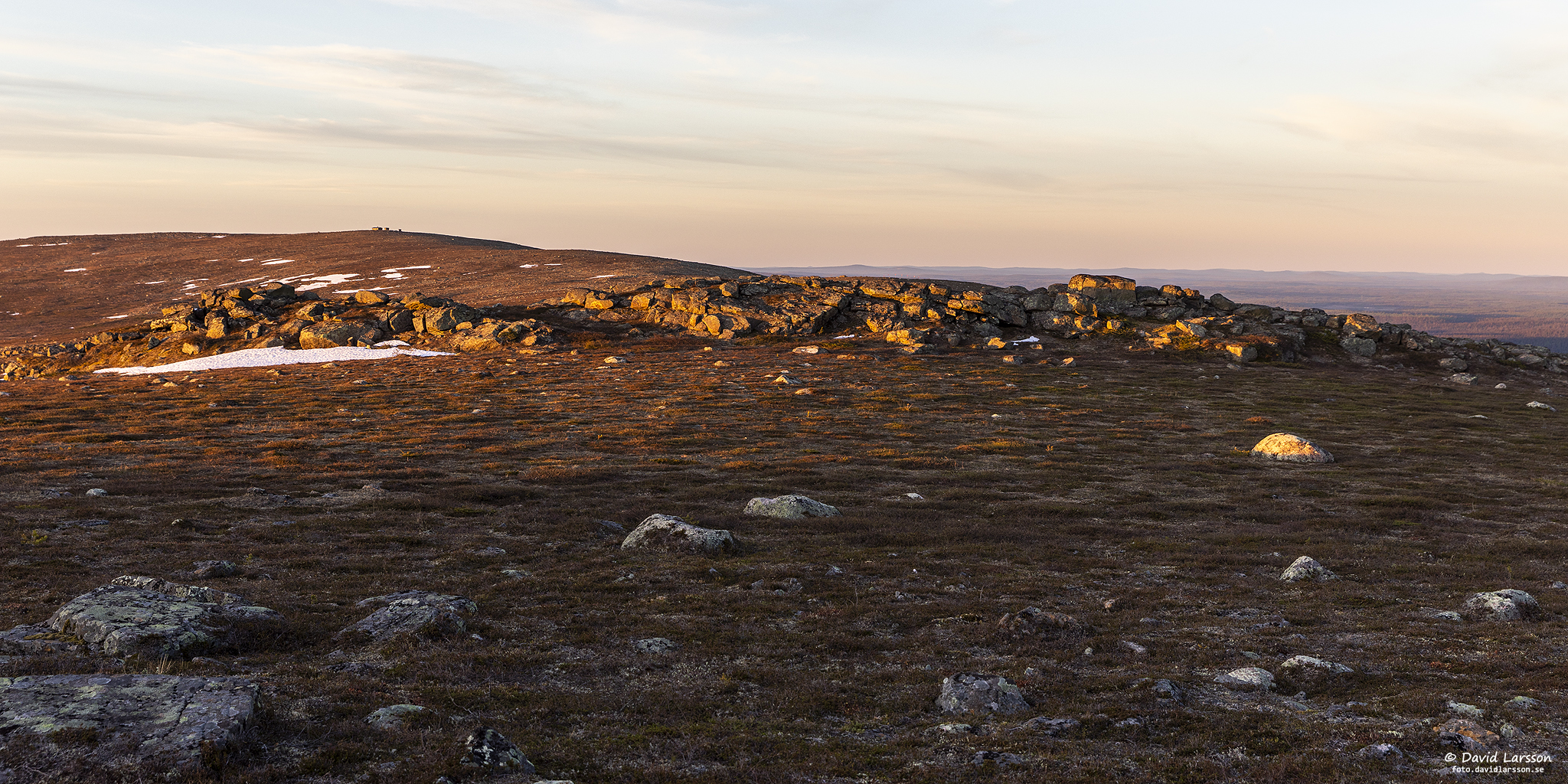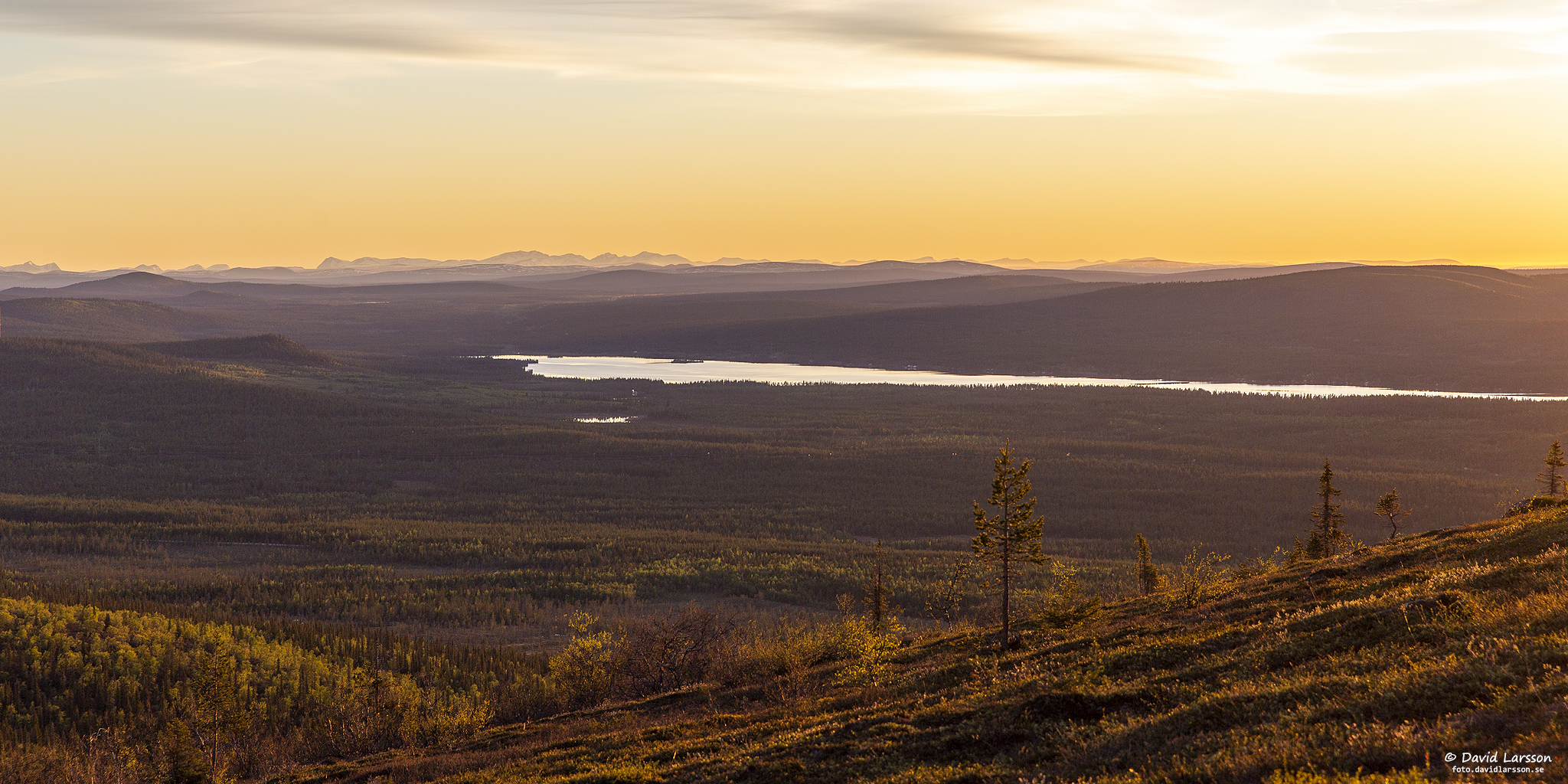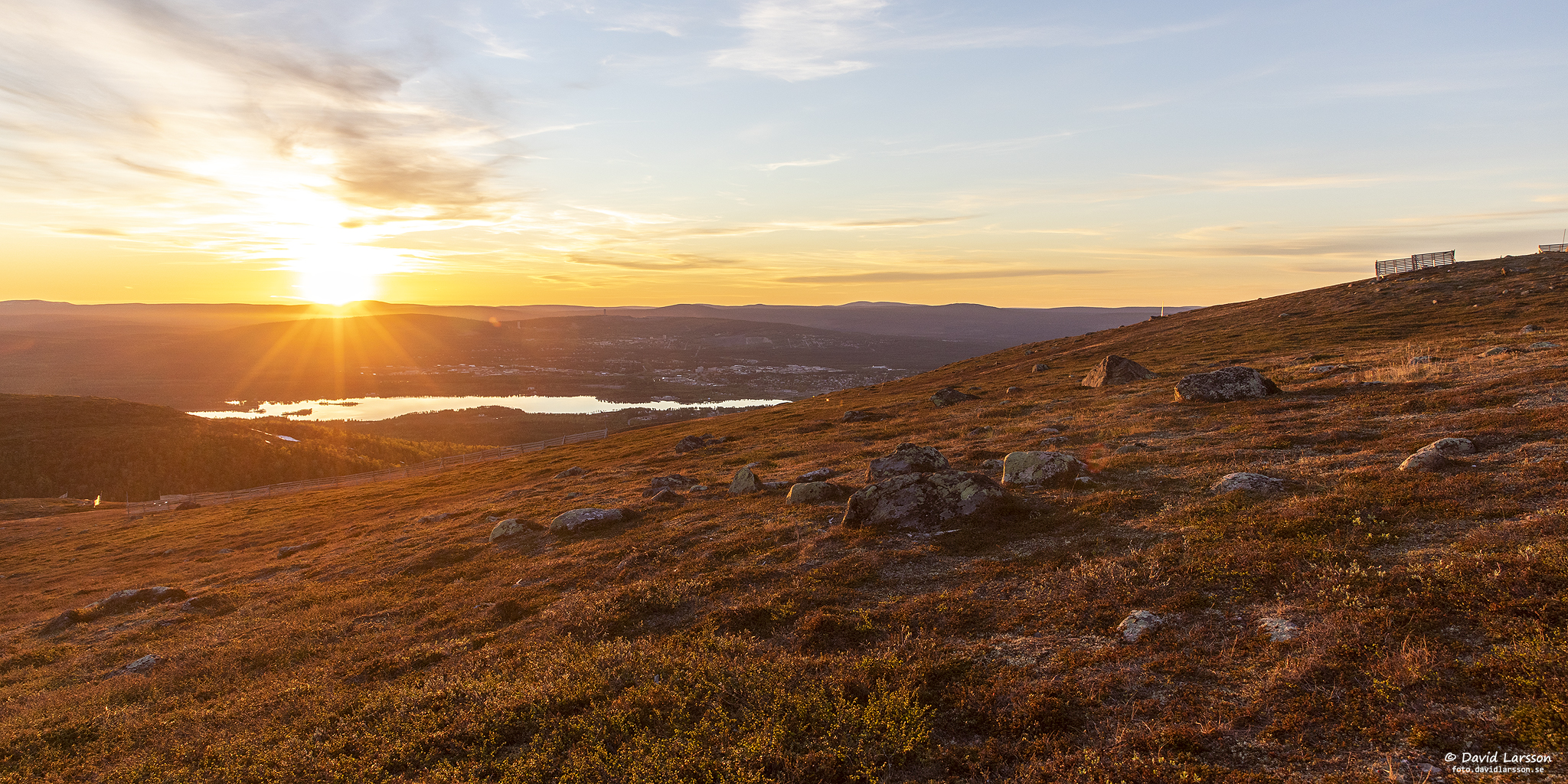 Solsken över Lilla toppen på Dundret något före midnatt med utsikt ner mot Vassaraträsk och med Gällivare och Malmberget till höger.