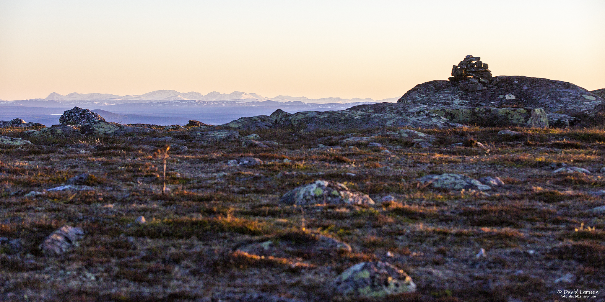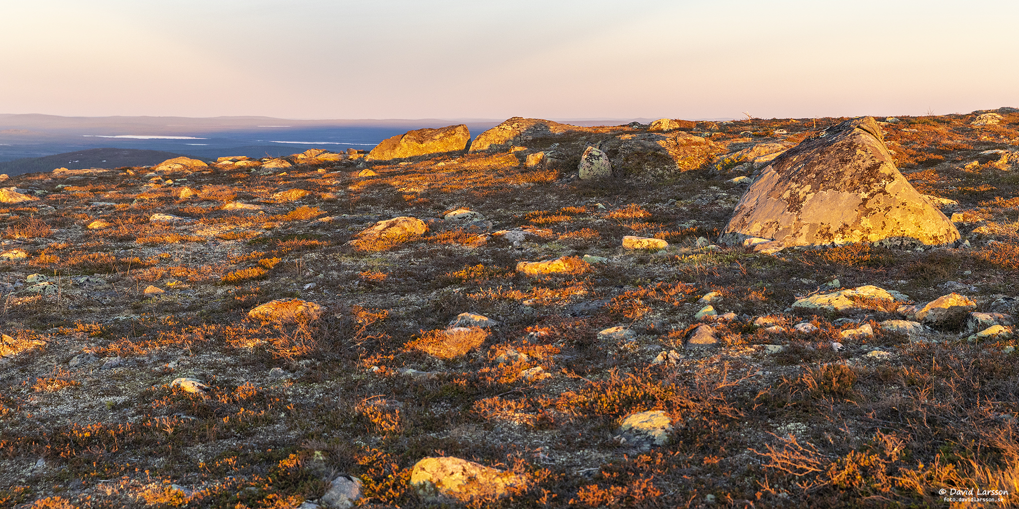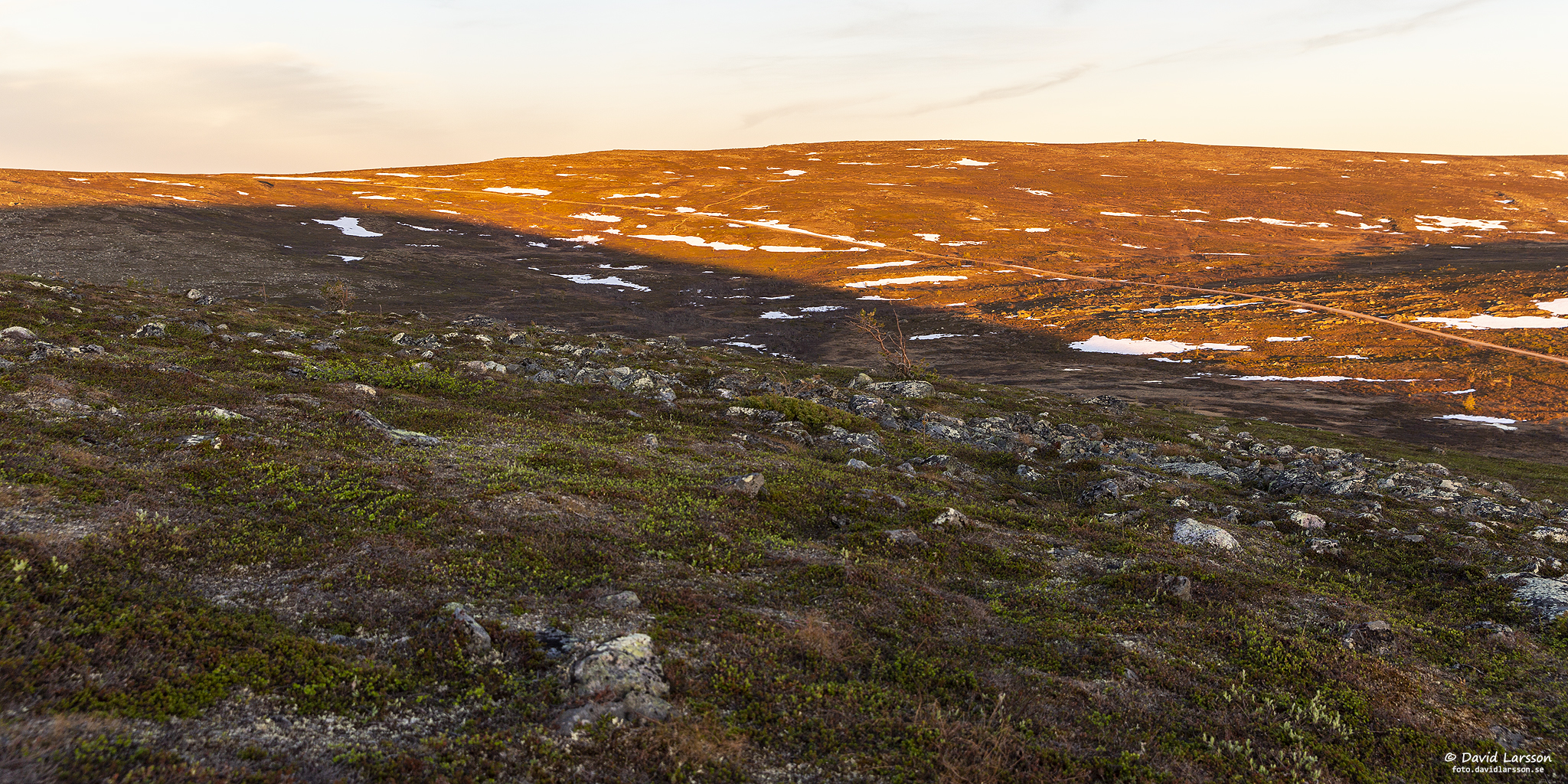 Solen lyser in längs med fjällhedarna på Lilla toppens västsluttning och skapar skuggor och ljuseffekter i växtligheten. I fjärran syns Kebnekaisemassivet långt bortom Sikträskets vatten.