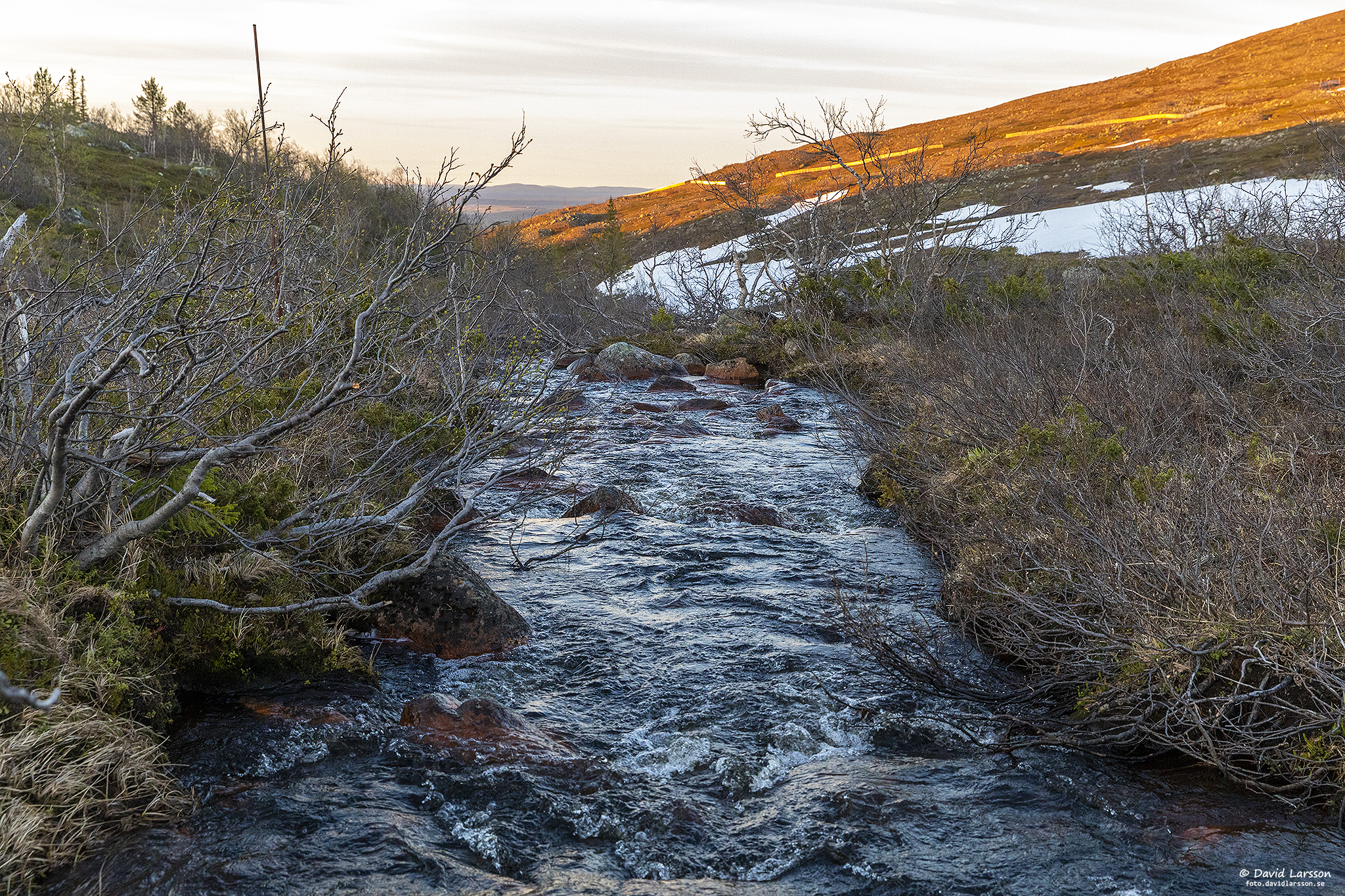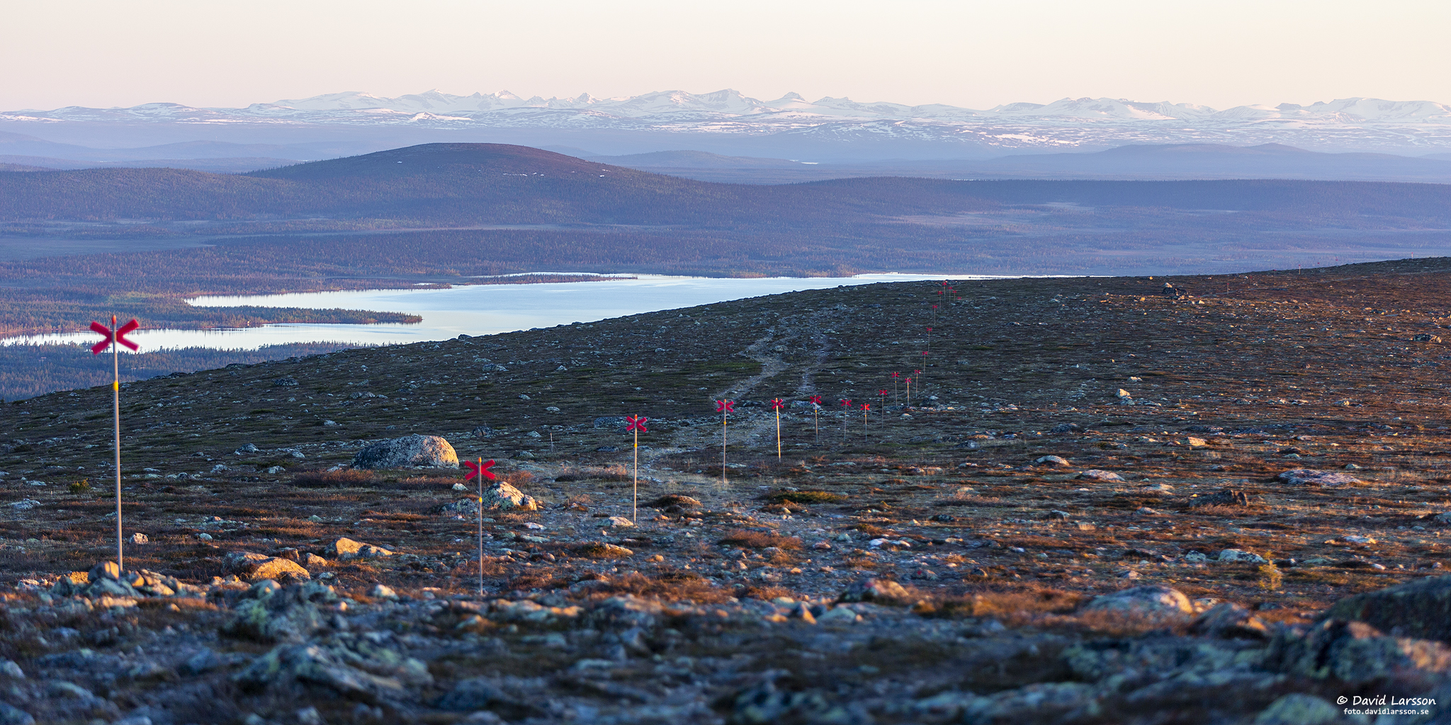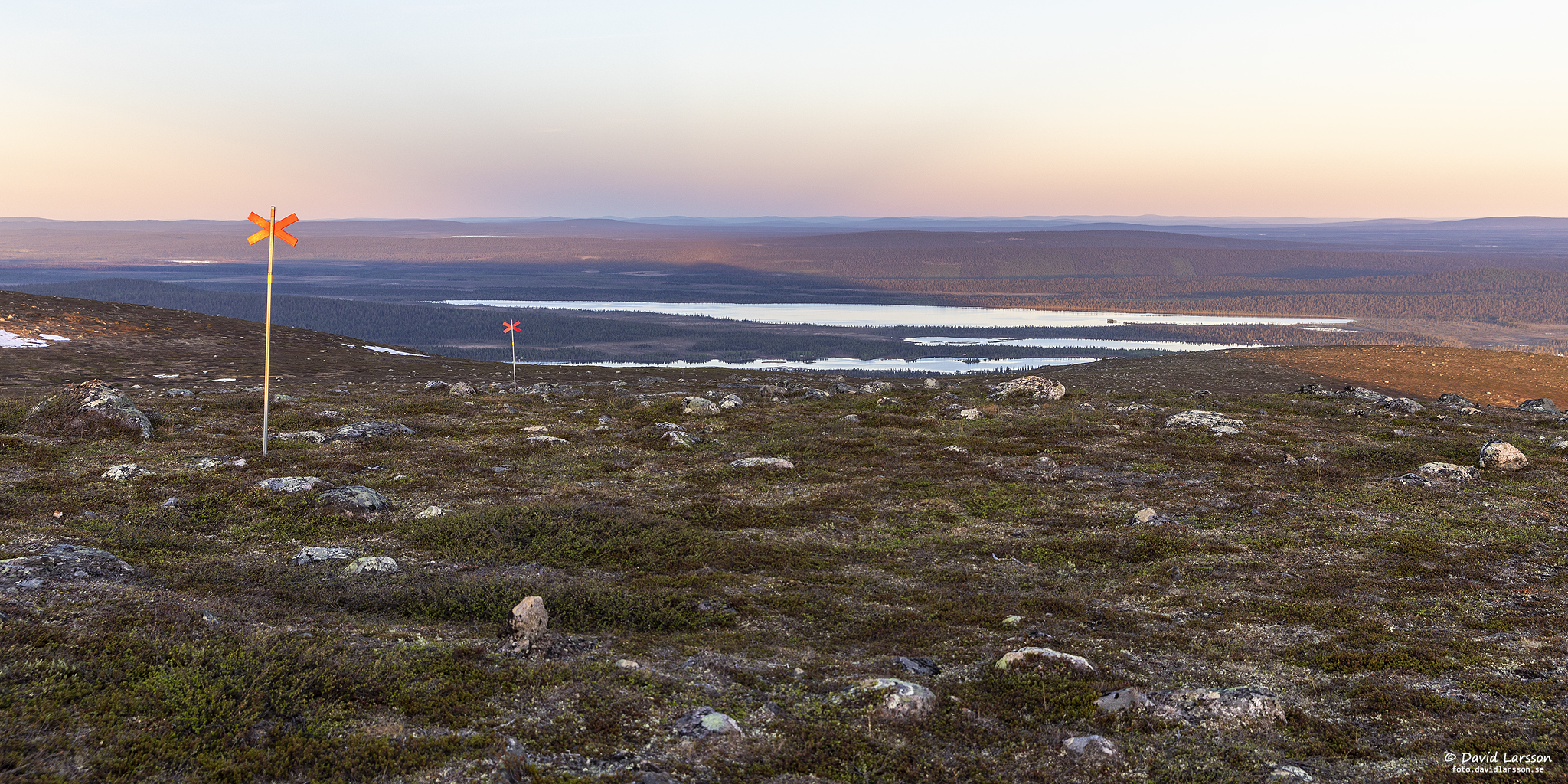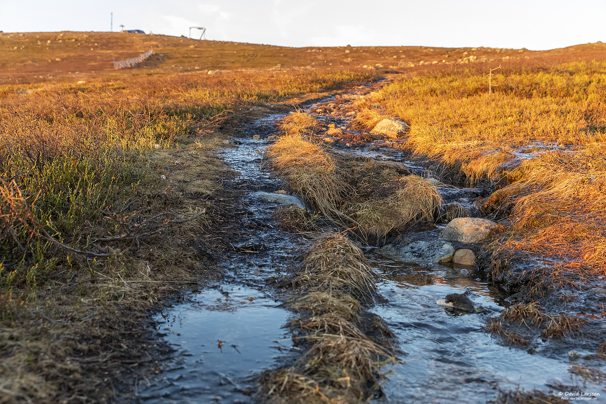Som vanligt så här års står leden under vatten en kort bit strax öster om Kelvatoppen där terrängen är flack och avrinningen därmed obefintlig. Fjällheden är dock lättgången var som helst och vattenytan skapar vackra ljuseffekter när solen nu åter sakta stiger upp på himlen.
