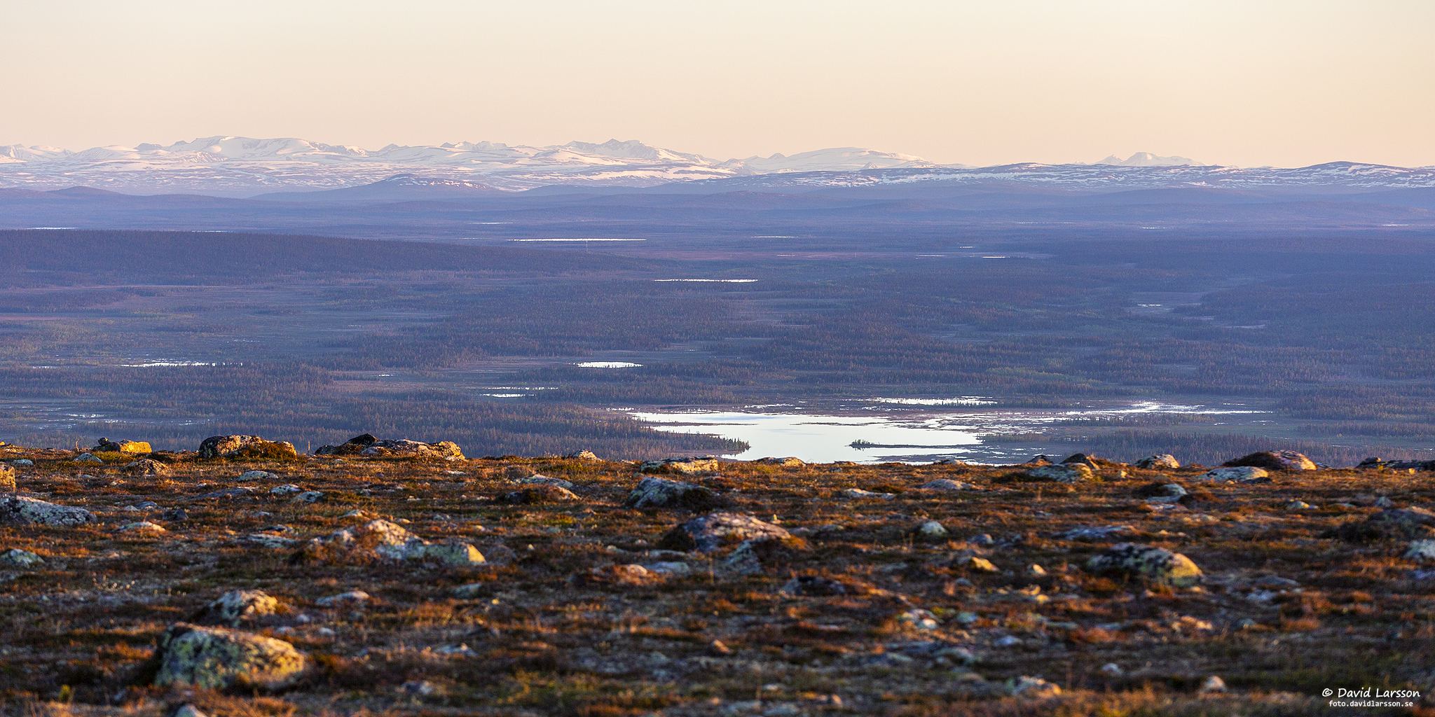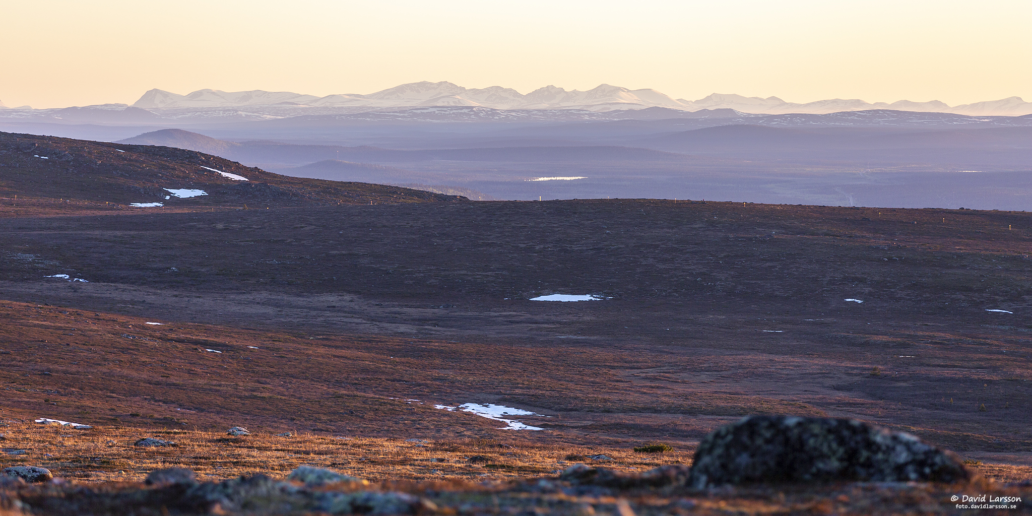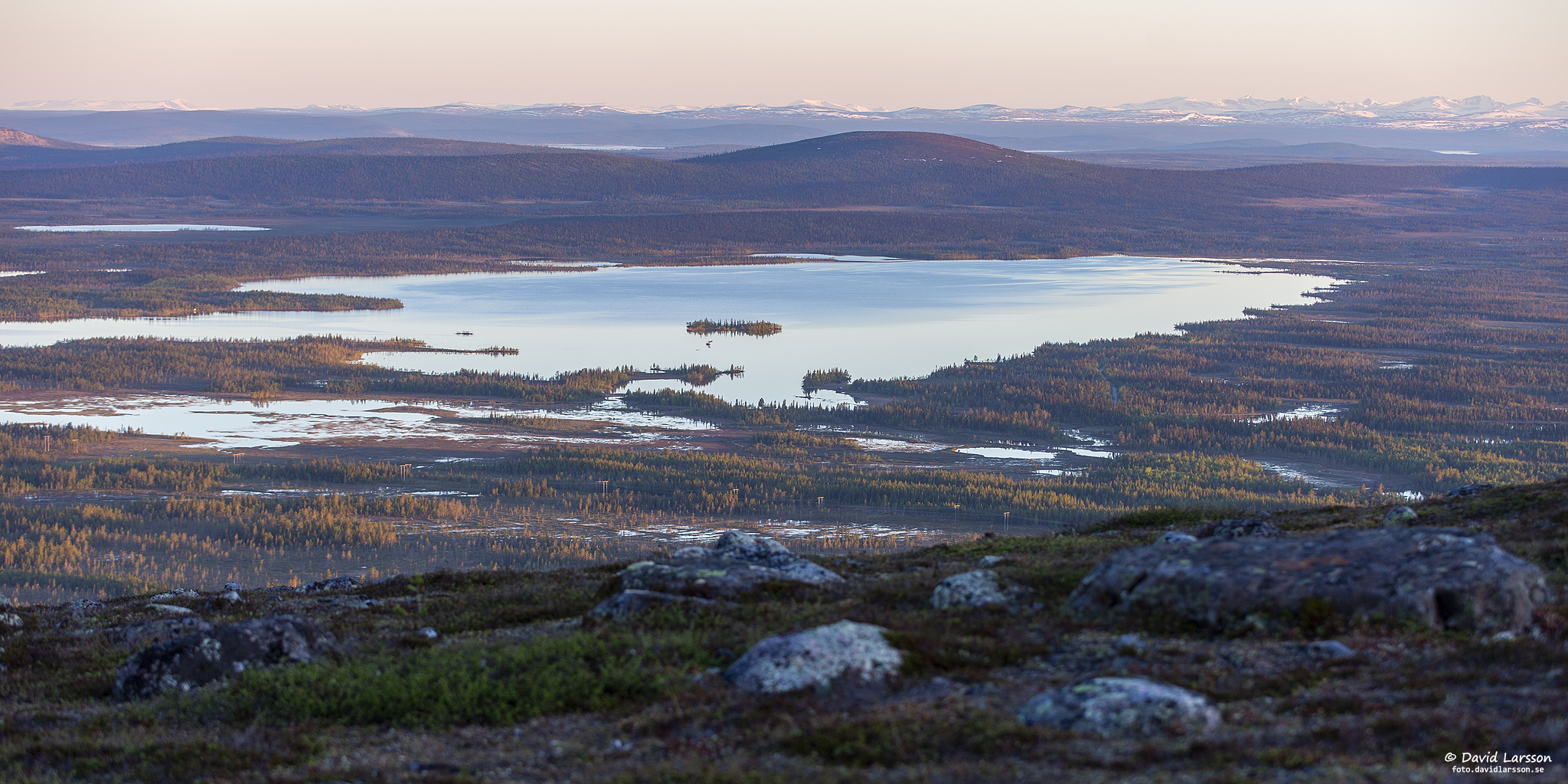 Njiehtsakjávrre, den större sjön väster om Dundret, är omgiven av många vattenfyllda myrar så här i slutet av snösmältningen.