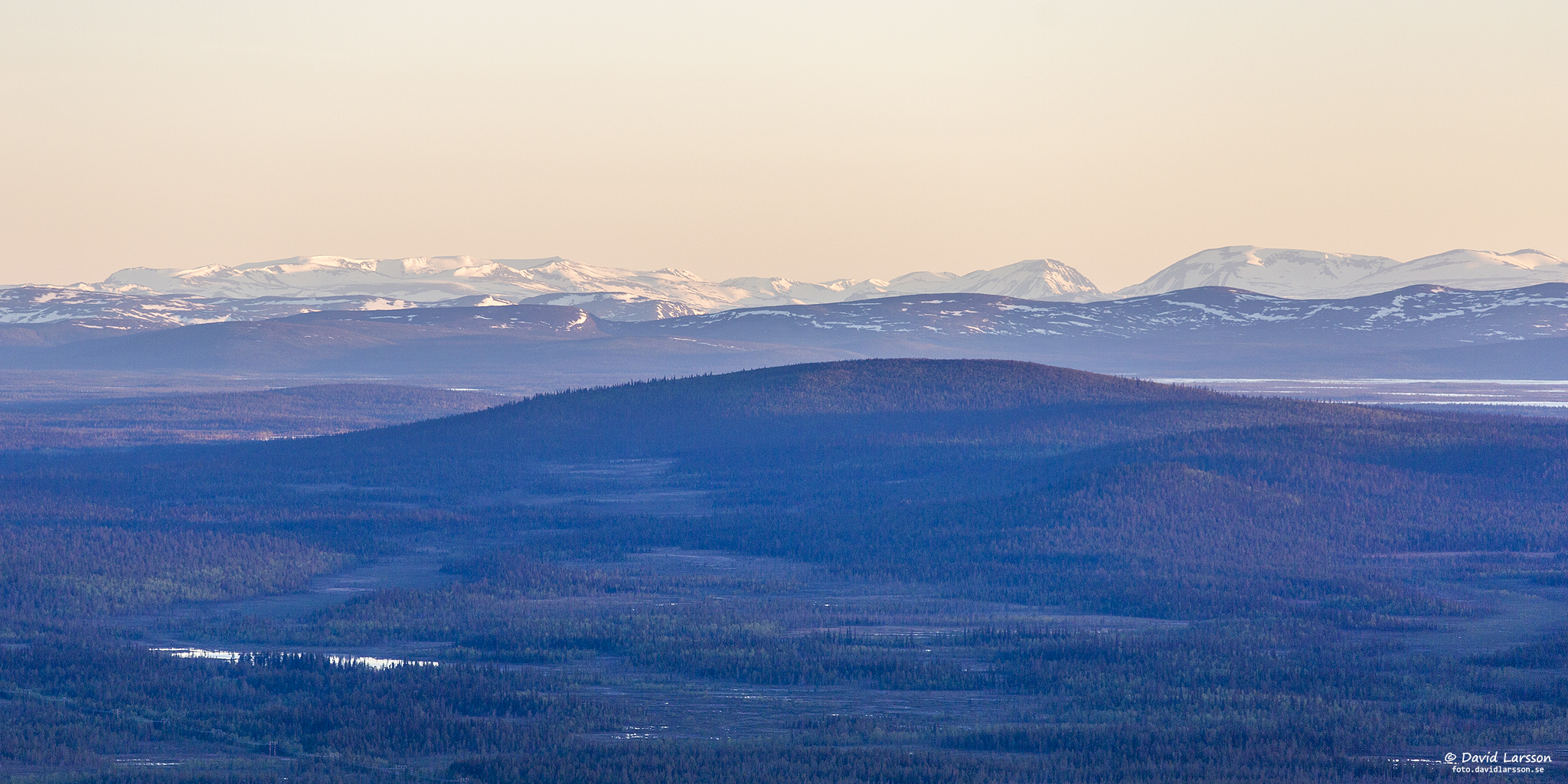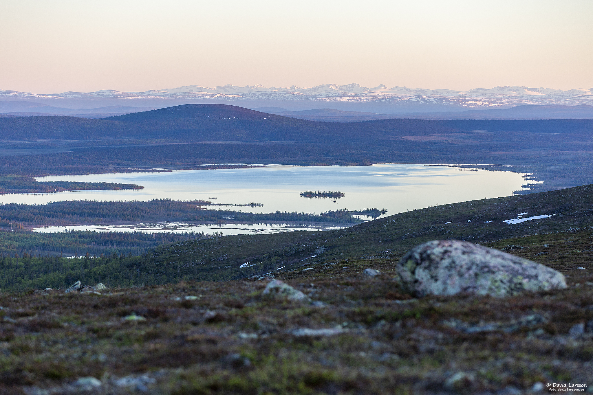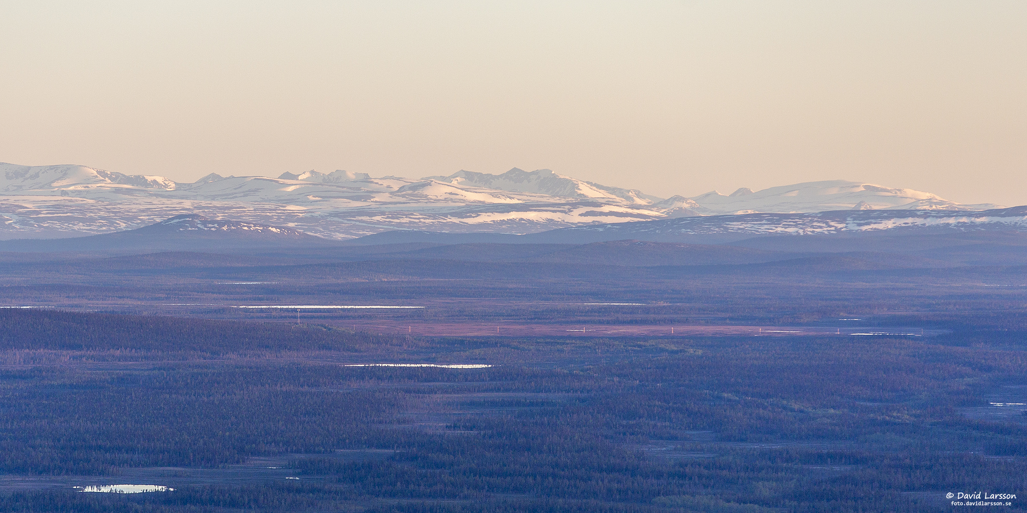 Njiehtsakjávrre, den större sjön väster om Dundret, är omgiven av många vattenfyllda myrar så här i slutet av snösmältningen.