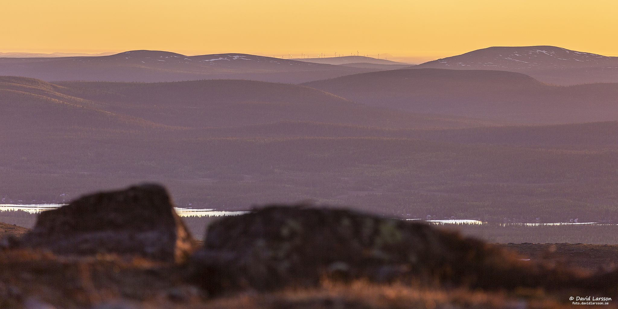 I riktning mot nordnordväst syns vindkraftparken på lågfjället Šišká i fjärran mellan de mer närliggande lågfjällen Roavvegiebli och Čorrugiebli. Bakom stenarna i förgrunden syns också Sikträsket med sin ganska täta fritidsbebyggelse längs stränderna.