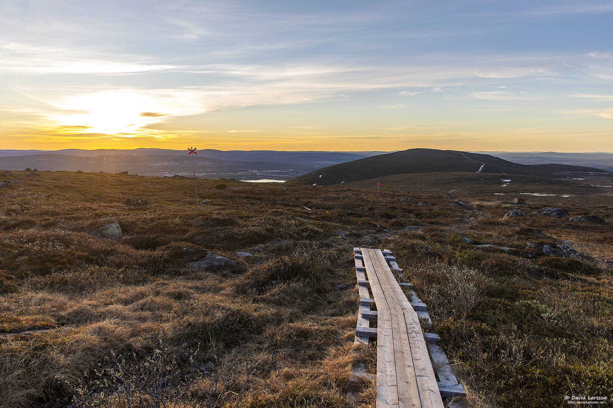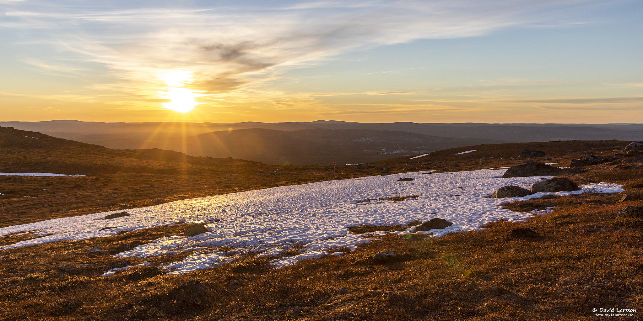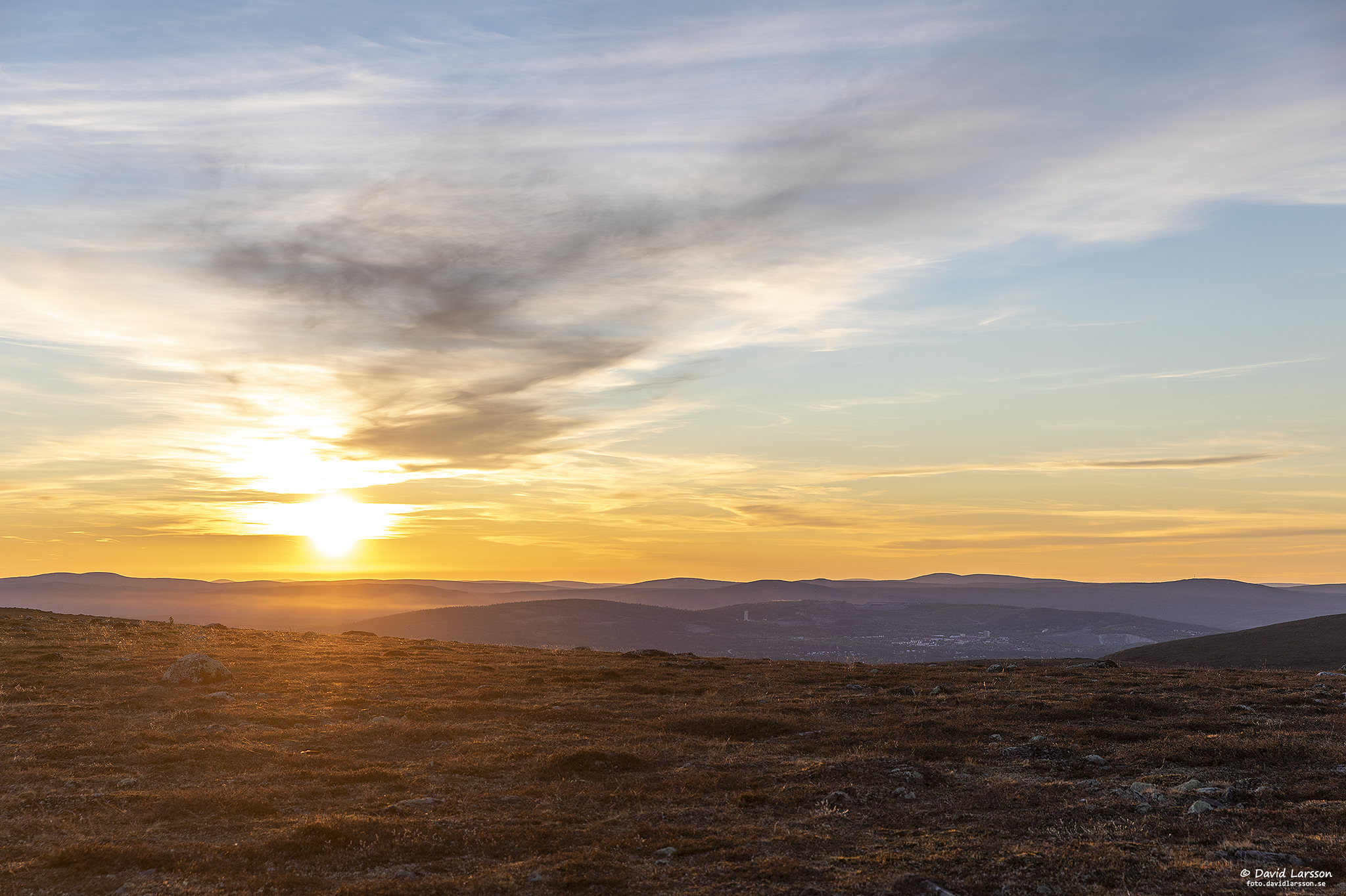 Några små molnslöjor låg kvar på himlen under natten och dämpade tidvis solljuset en aning. Här syns också centrala Malmberget i fjärran till höger, ett samhälle som just nu försvinner allt mer.