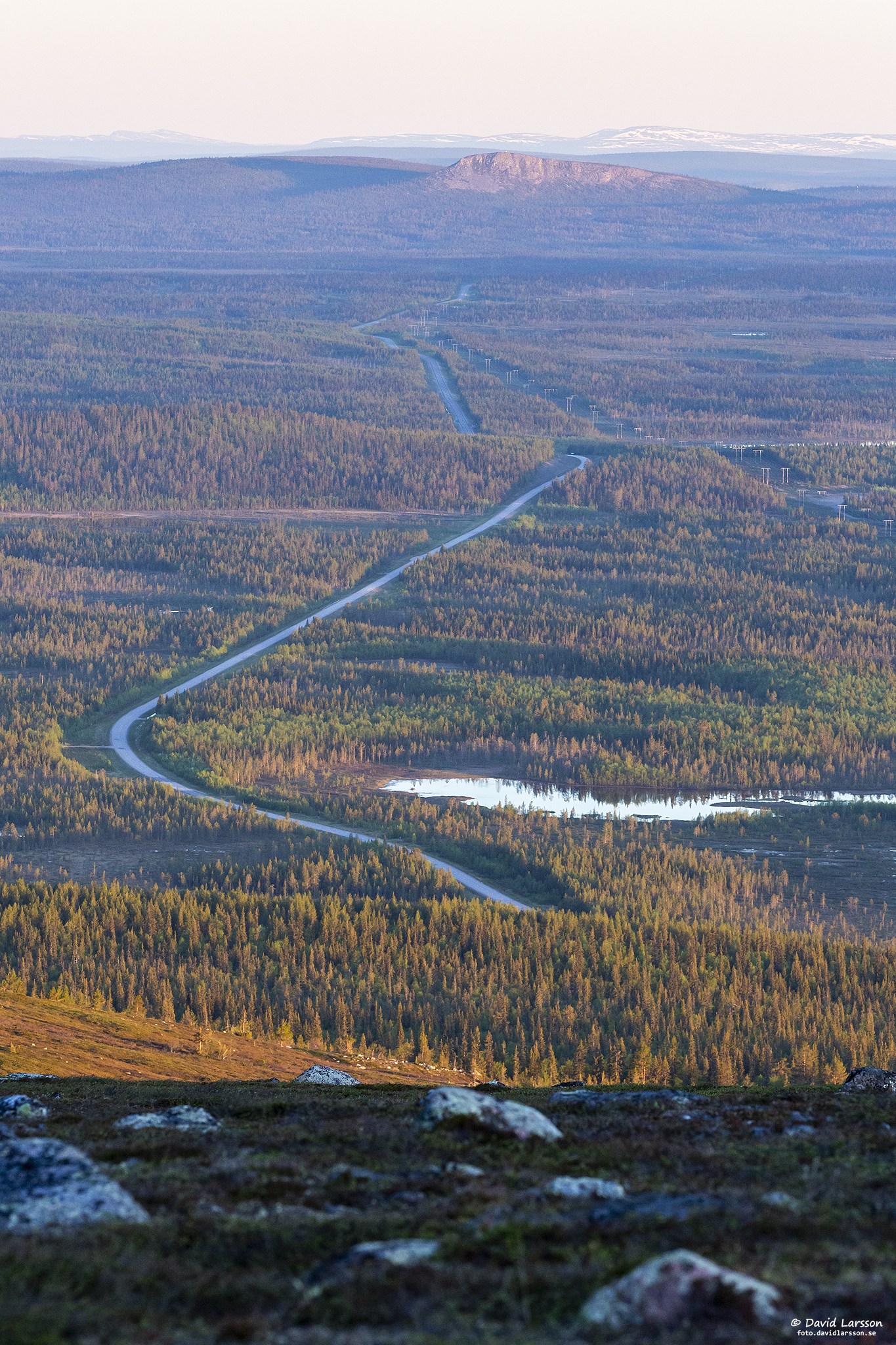 Västerut syns fortsatt Sarekfjällen, Njiehtsakjávrre och Niehtsagistjåhkkå, men nu också väg E 45 som går över myrarna norr om Muddus nationalpark bort mot Stubbabergen och vidare mot Porjus.