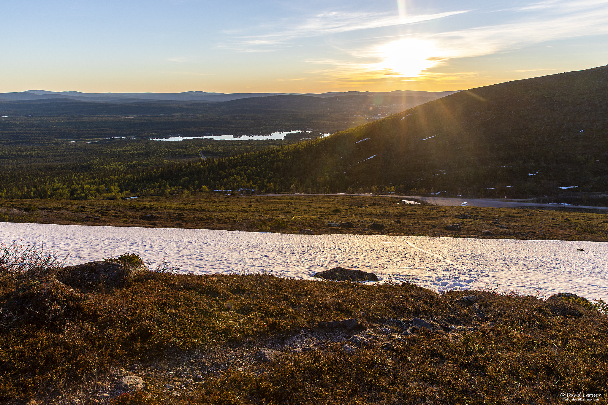 Lilla toppen skapar också en skugga över de inre delarna av Dundret. Så här något före midnatt ligger dock ännu vägen upp på fjället i solsken till glädje för dem som väljer att njuta av solen från bilen.