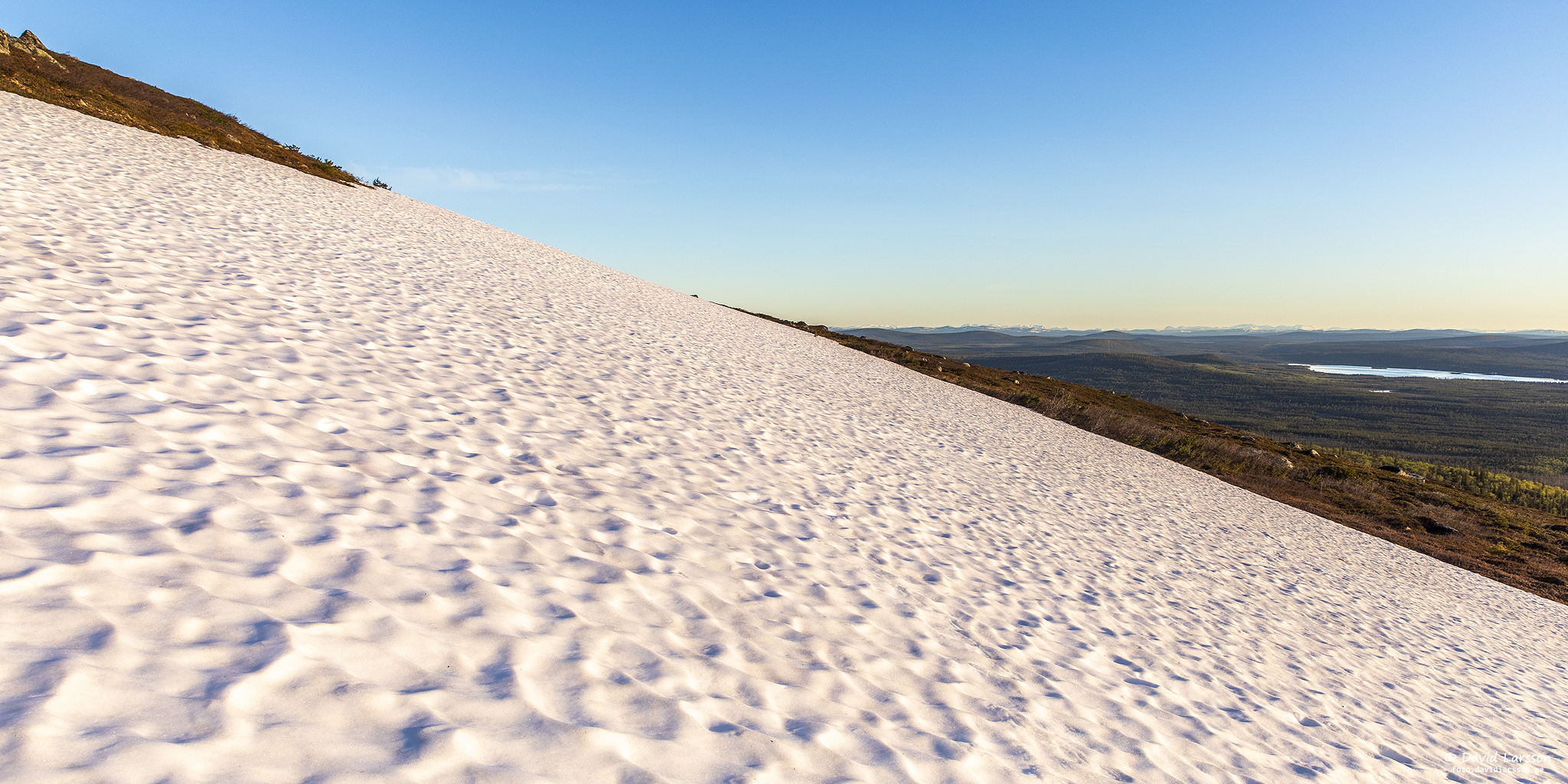 Här ligger snön ännu så tjock att man utan större problem kan gå på den trots många plusgrader i luften. Snön breder ut sig som en stor kritvit sandstrand där snösmältningen skapat vågmönster i ytan.