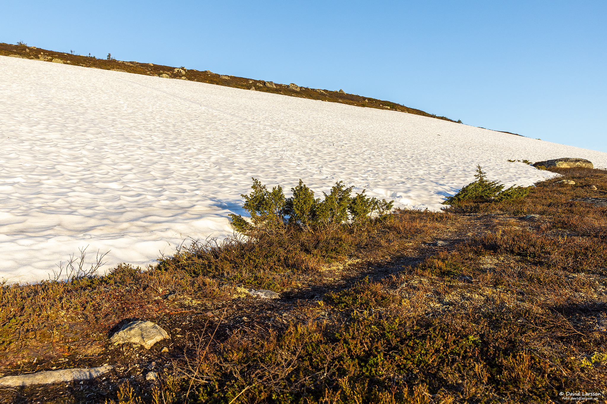 Vissa ytor med snö kan hittas även på mer plan mark där solljuset torde nå fram stora delar av dagen. Kanske har det intilliggande stenblocket skapat drivbildning och extra tjockt snötäcke här.