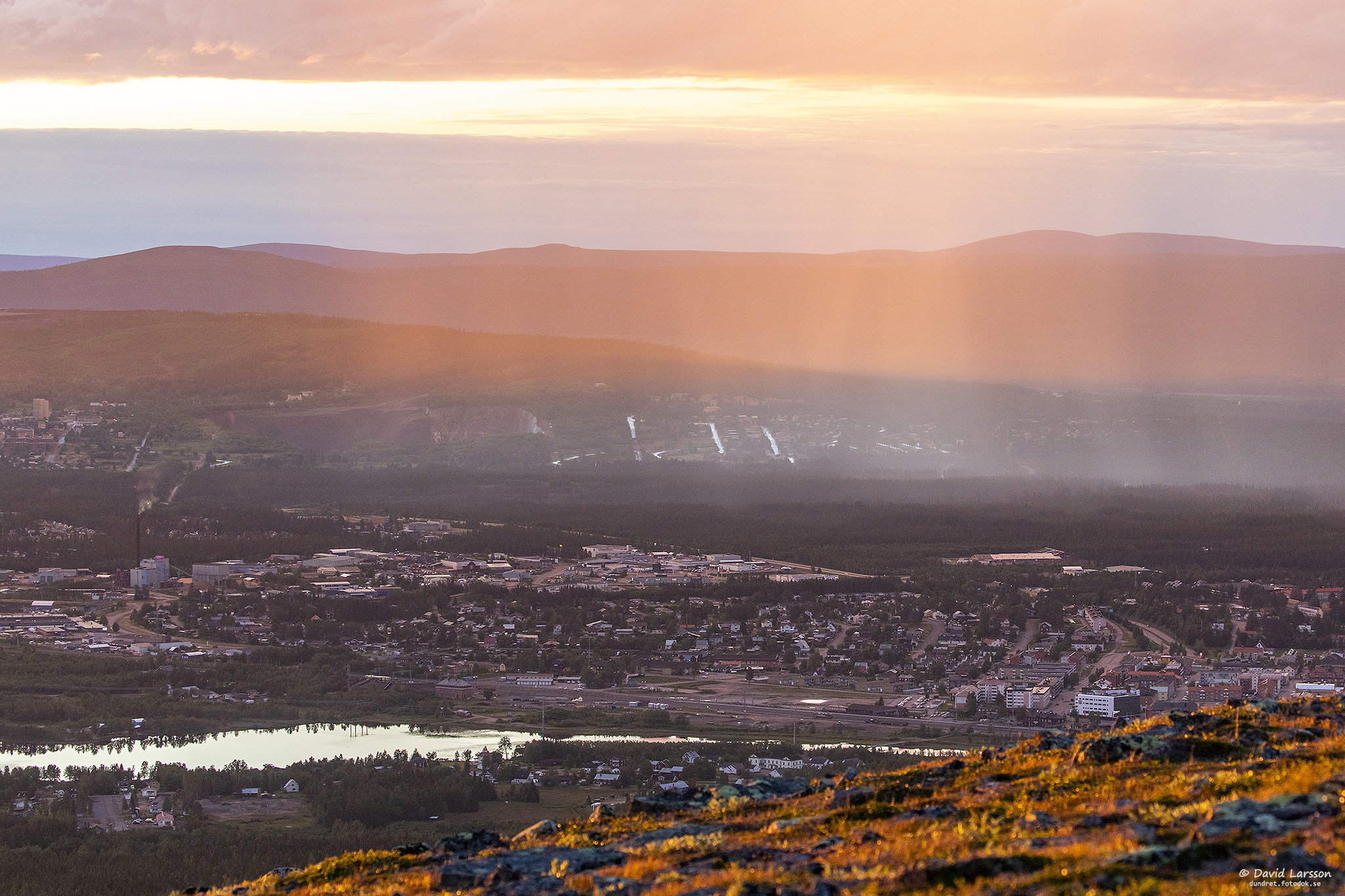Regnet rör sig mot Gällivare i den stilla sommarkvällen när ett ständigt surr från sommarens många myggor ackompanjerar utsikten.
