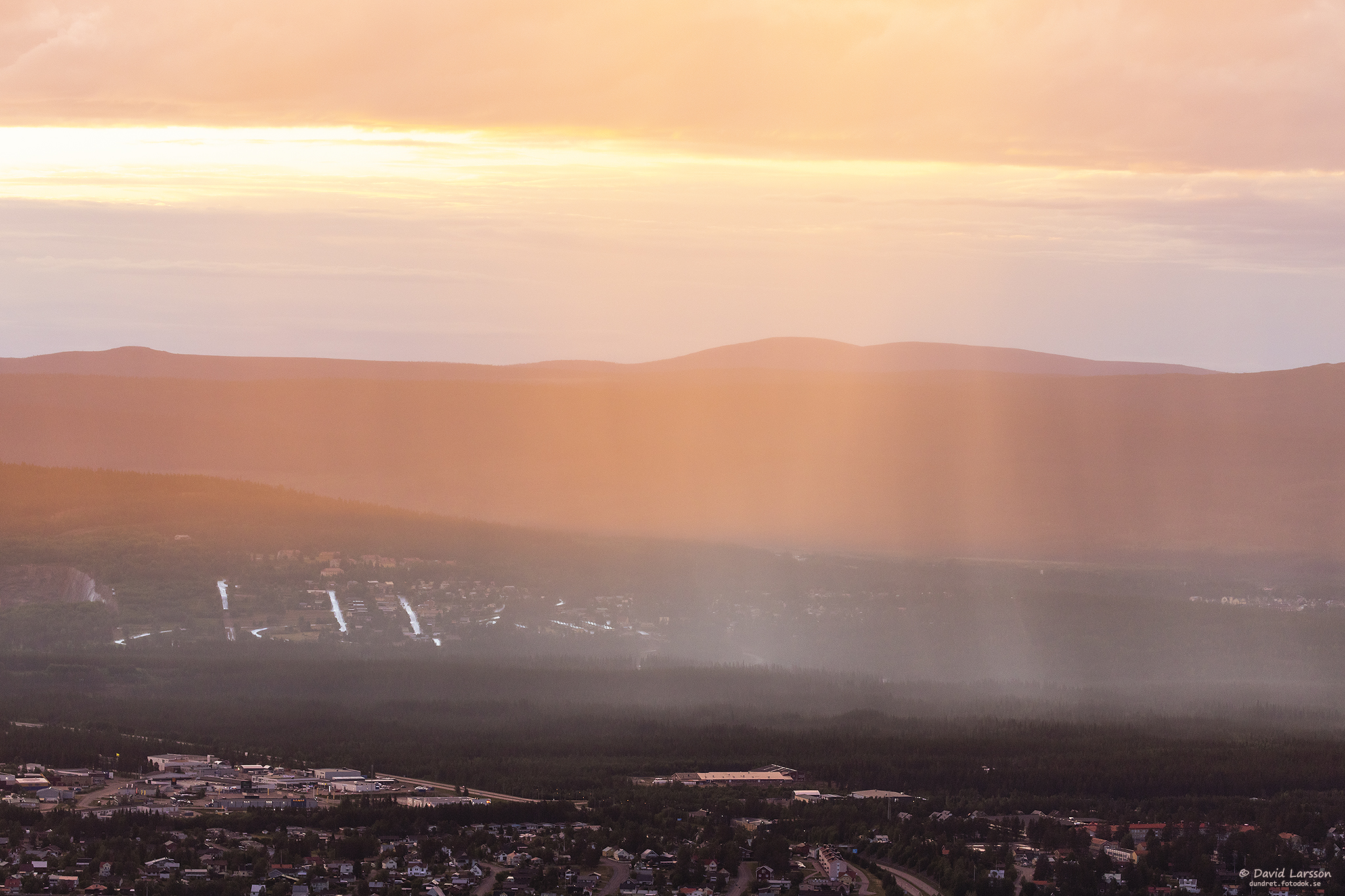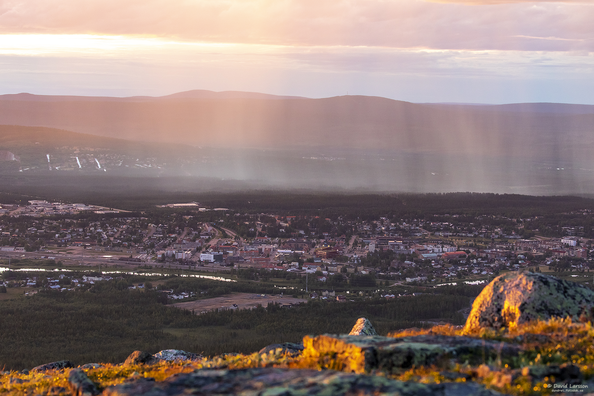 En lokal regnskur drar fram över Östra Malmberget strax före midnatt samtidigt som solen lyser upp fjällheden på Dundret.