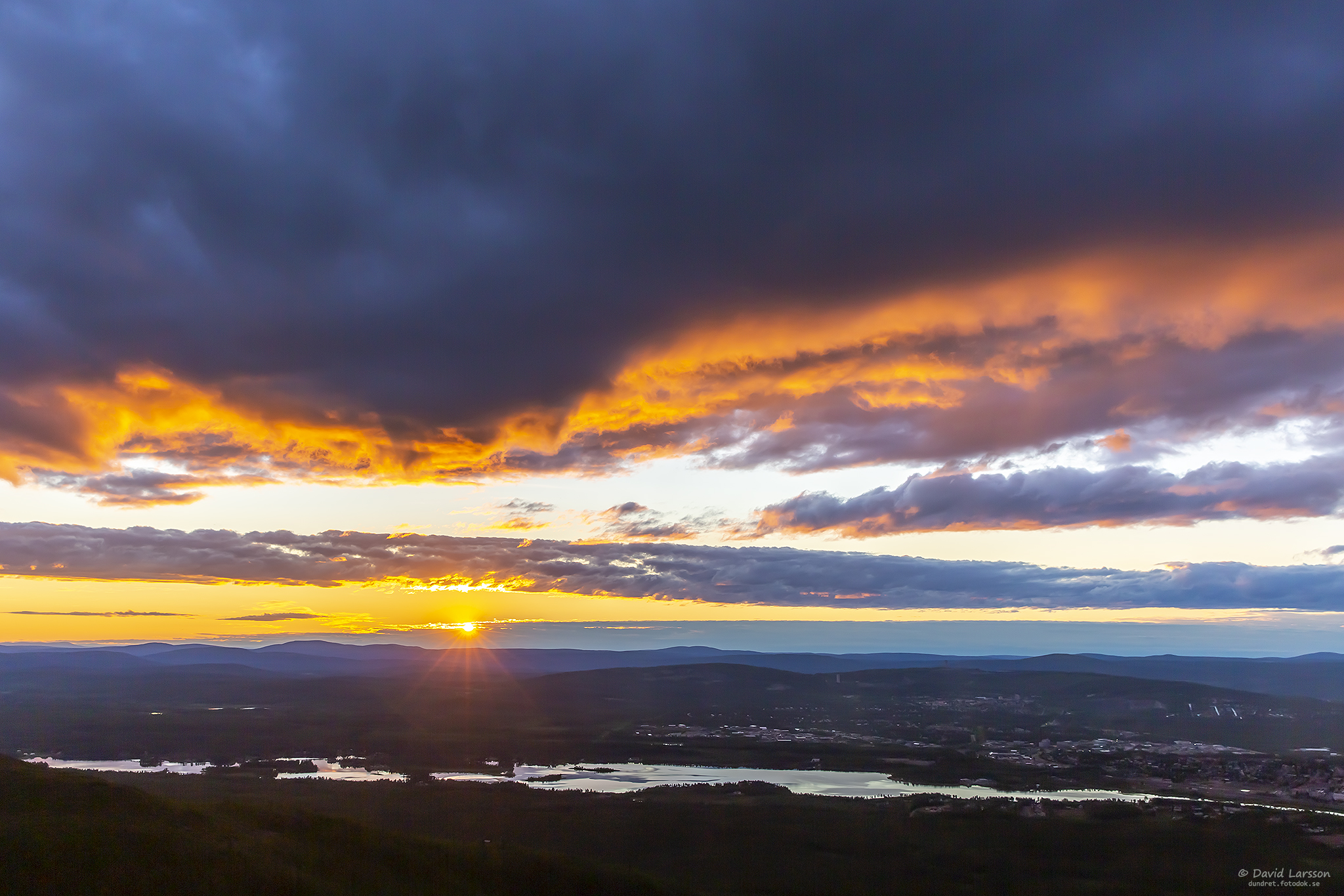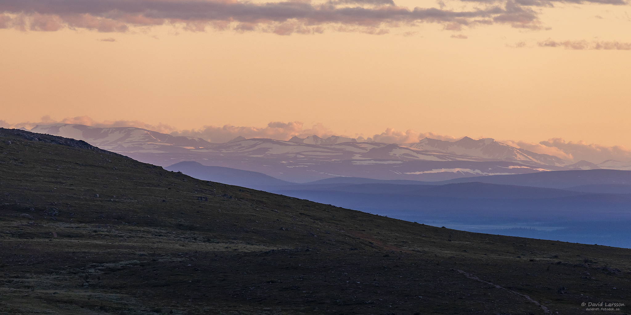 Den här kvällen försvann solen in bakom en molnbank vid horisonten redan minuterna före midnatt, långt före sitt minimum vid 00.40-tiden ovanför Bávgeduottar / Paukitunturi vid horisonten mitt i bild.