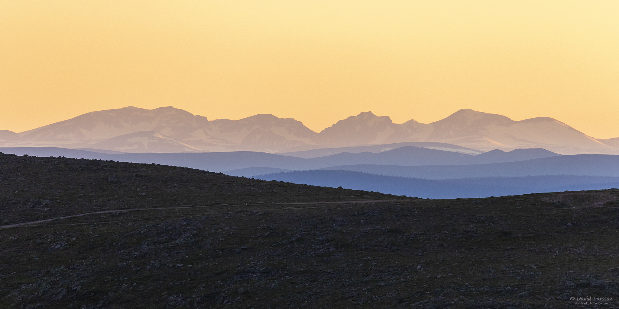 Vid horisonten i väster finns inga moln och Kebnekaisefjällen reser sig som vanligt mäktigt i nattljuset.