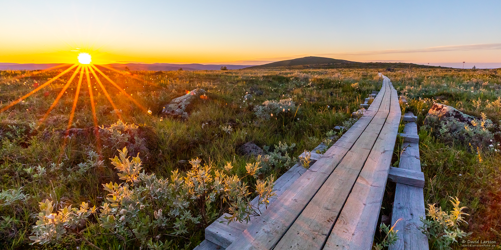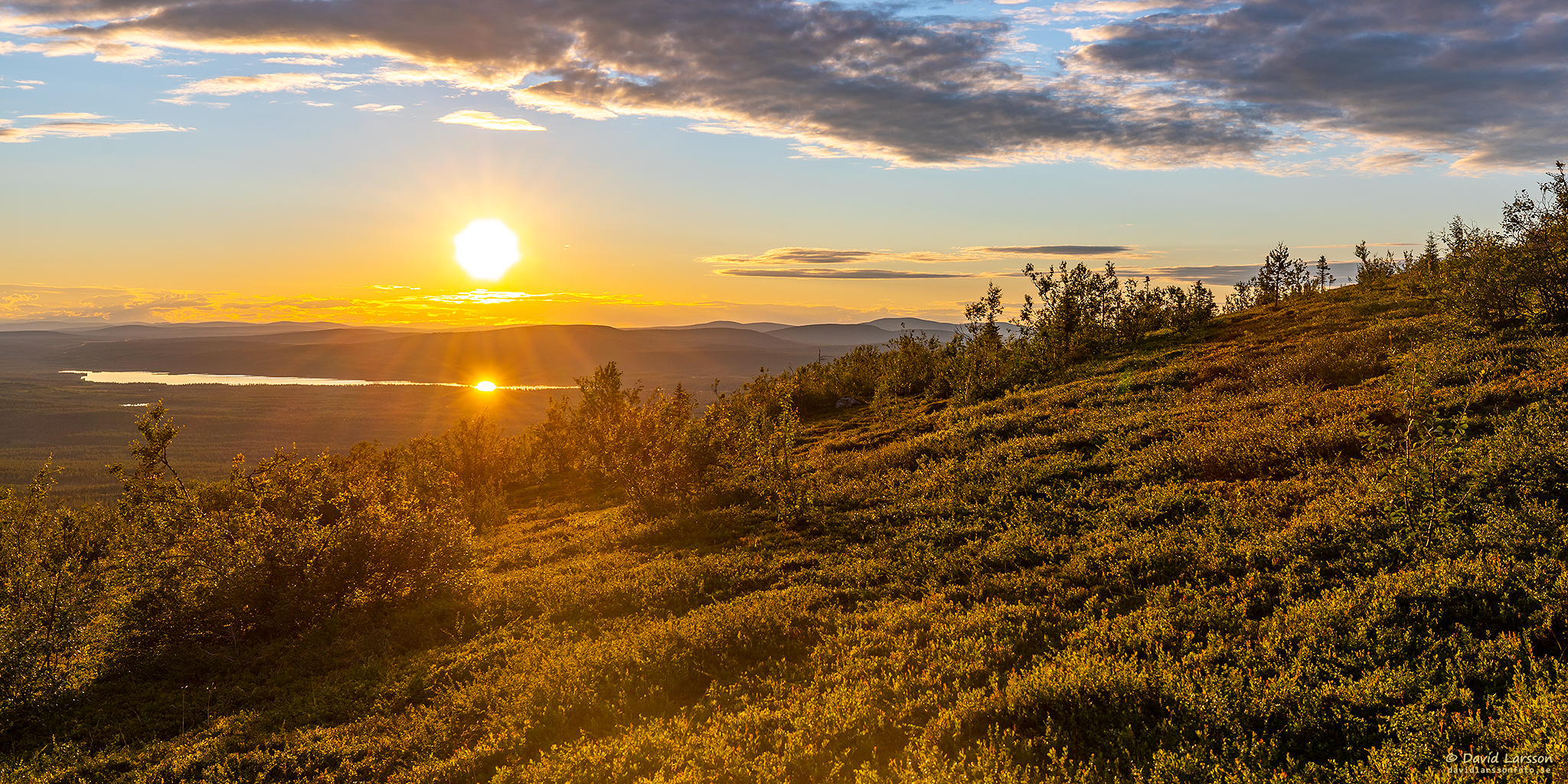 Solen smeker fjällhedarna på Linbanetoppens nordvästra sluttning samtidigt som den går in över lågfjället Čorrugiebli vid horisonten.