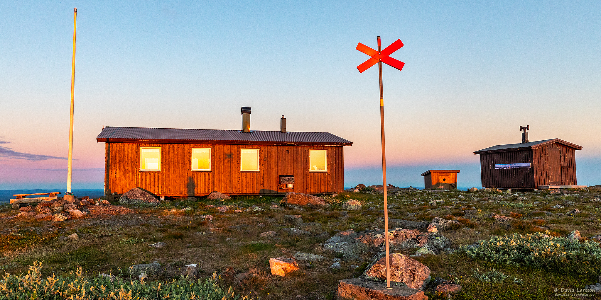 Väl framme på Stora toppen omkring tjugo minuter efter midnatt var det åter fullt solljus som lyste upp stugorna.