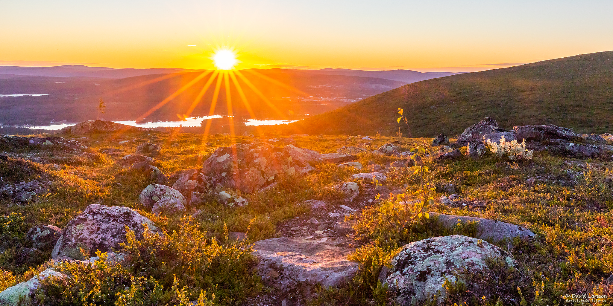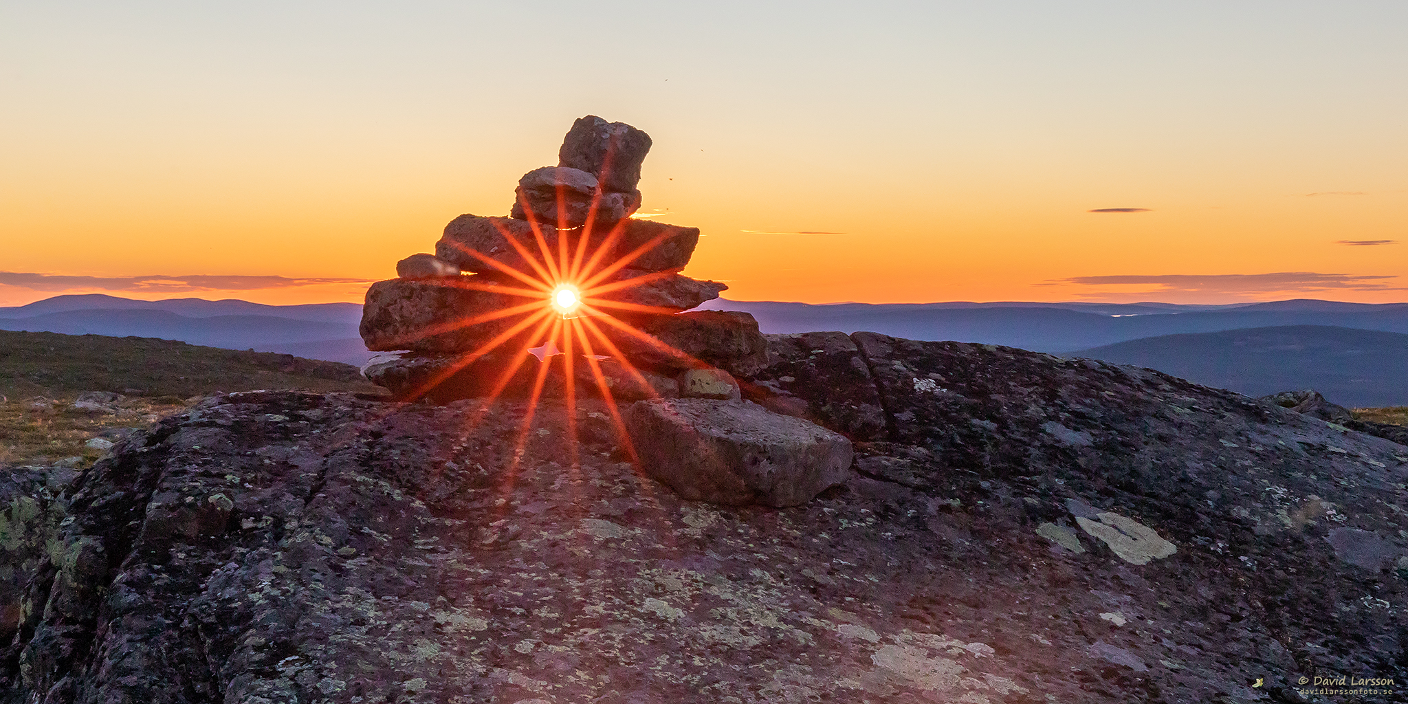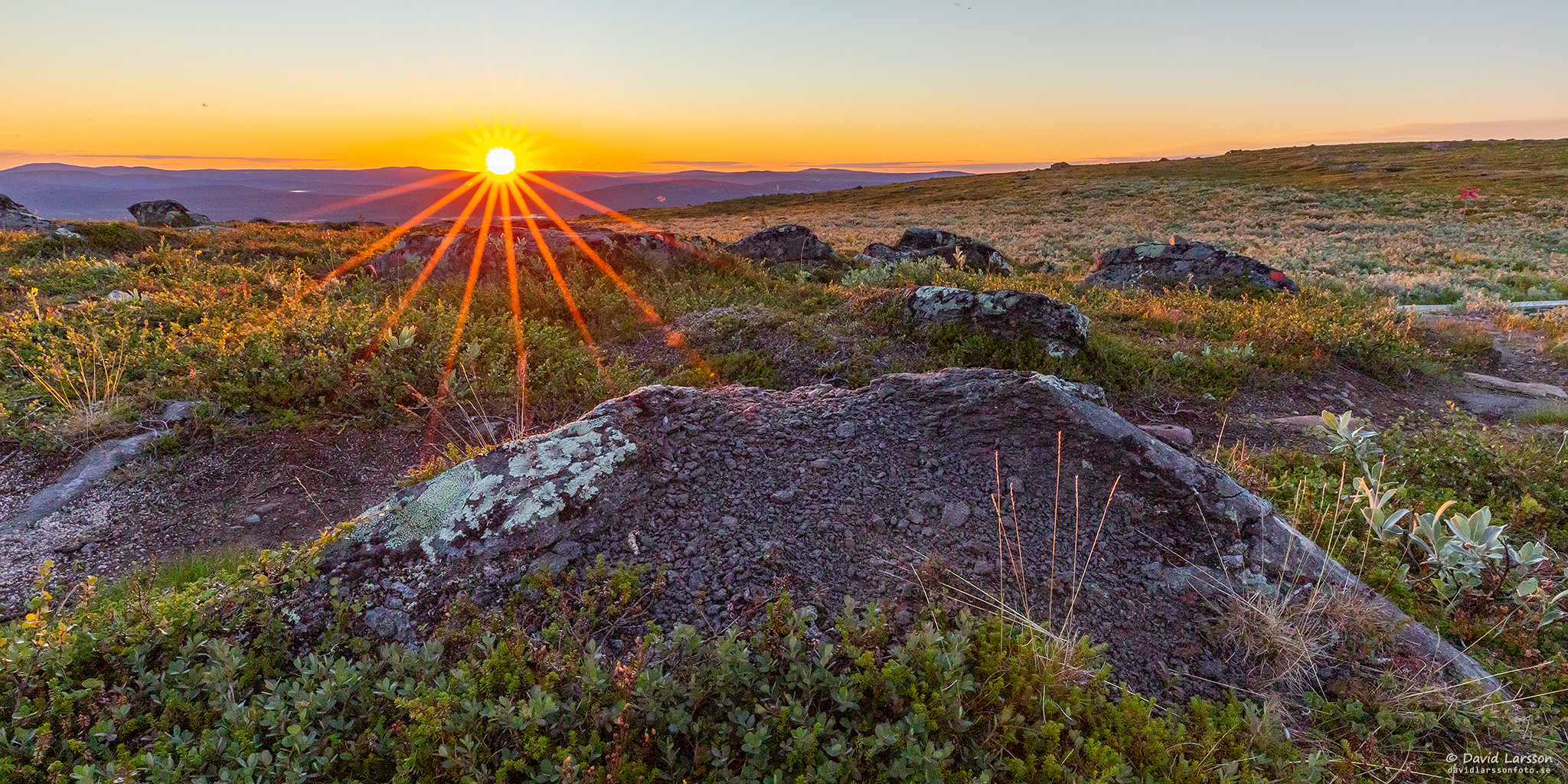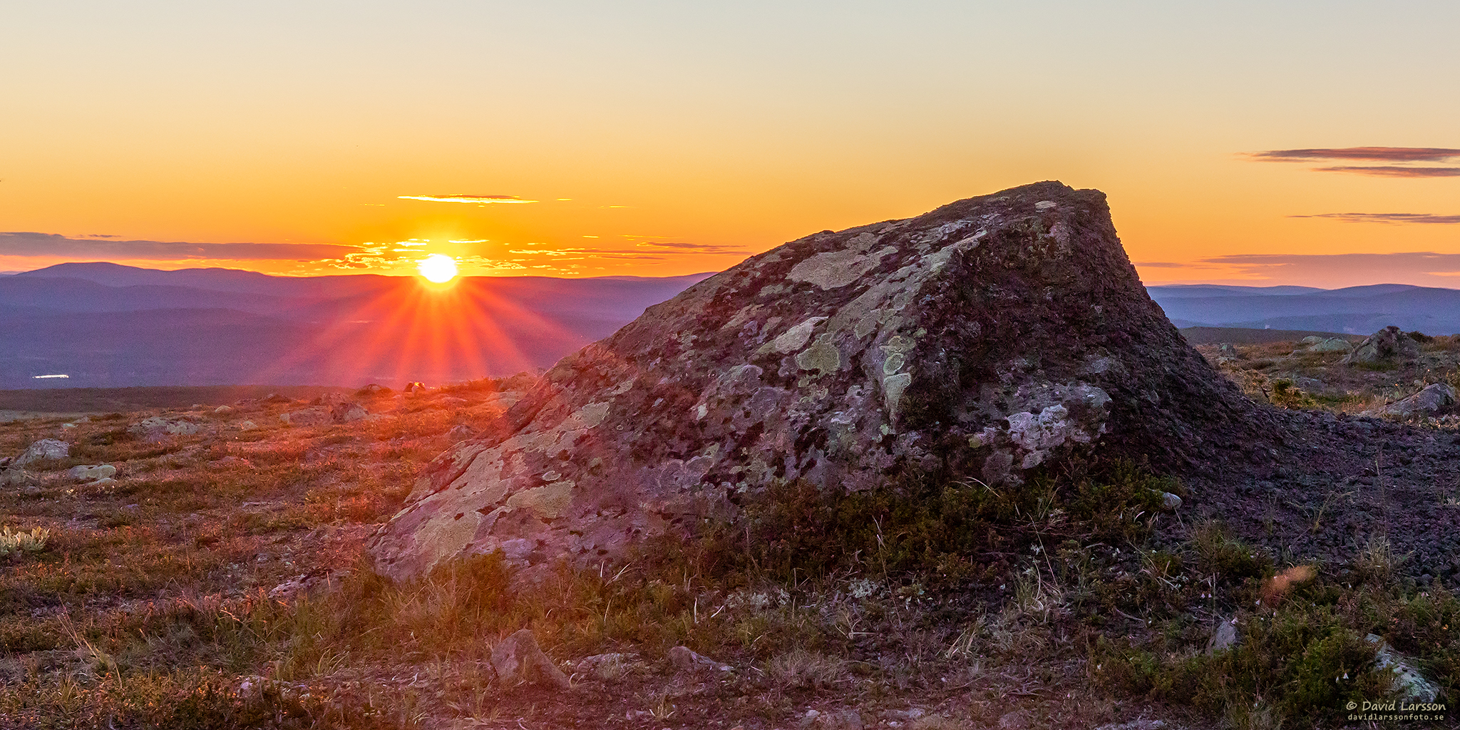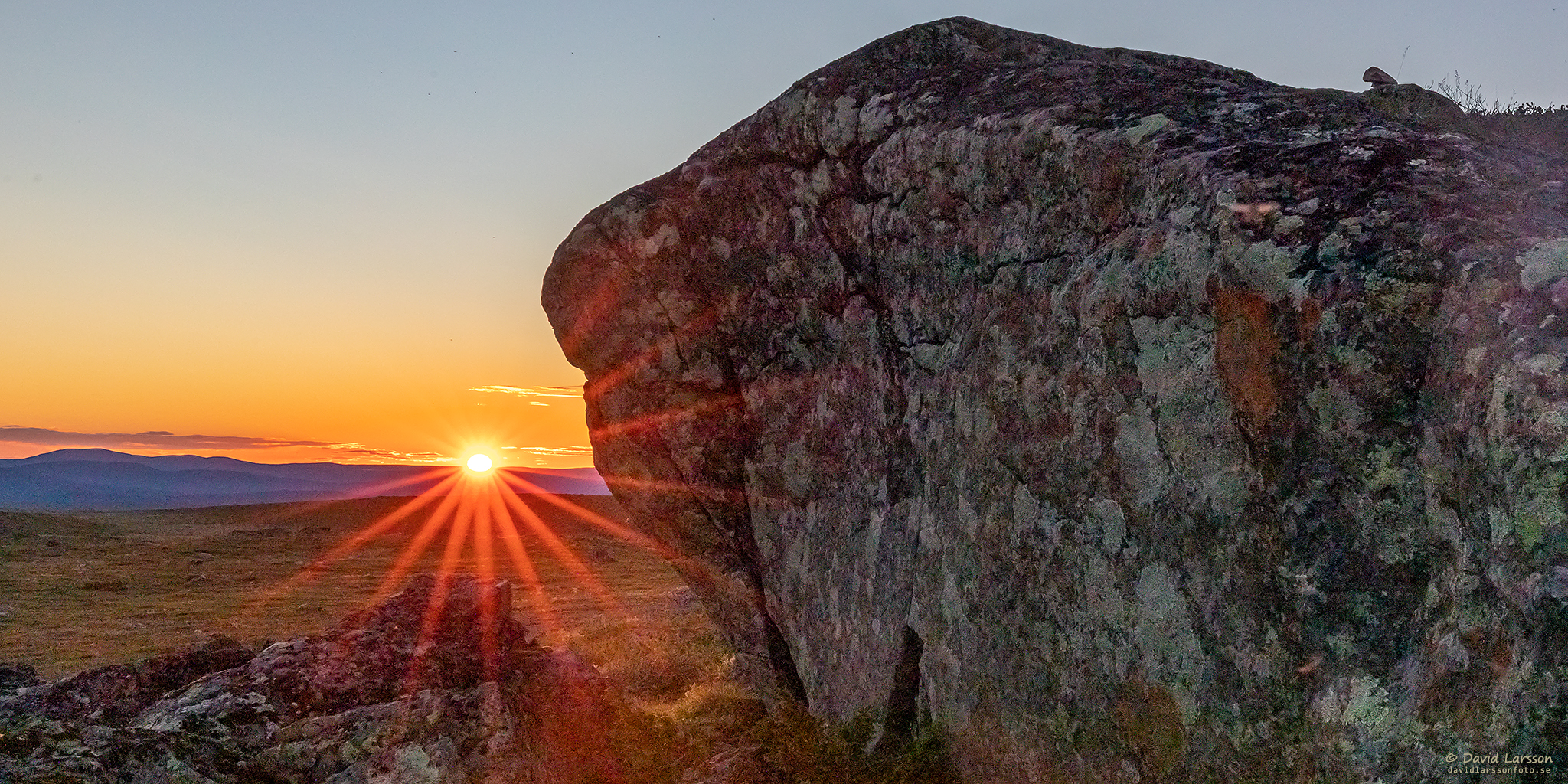Den halverade solen sänder ut sina strålar mot en av Dundrets större stenblock strax efter lokal midnatt.