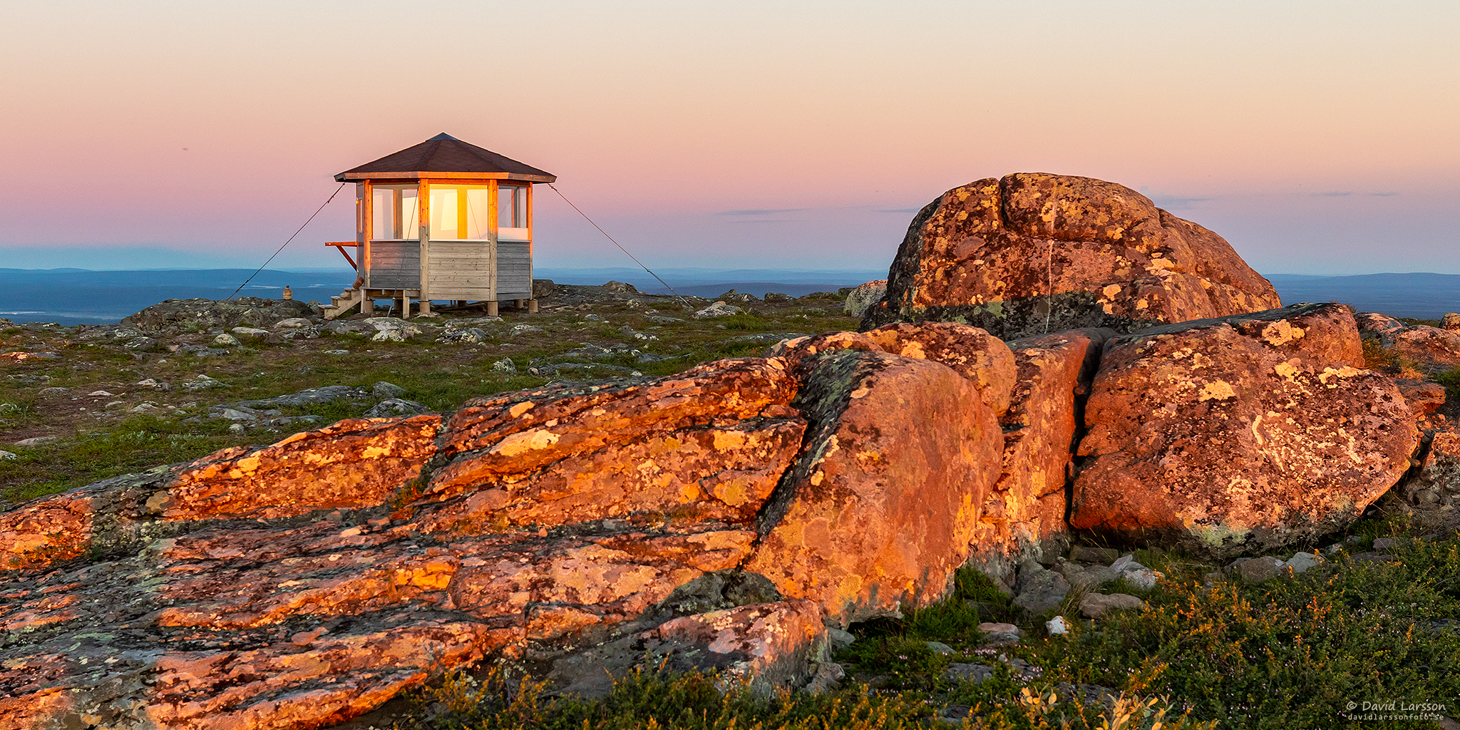 Solsken över Västtoppen / Hebrotoppen med sitt lilla vindskydd en kvart över ett på natten.